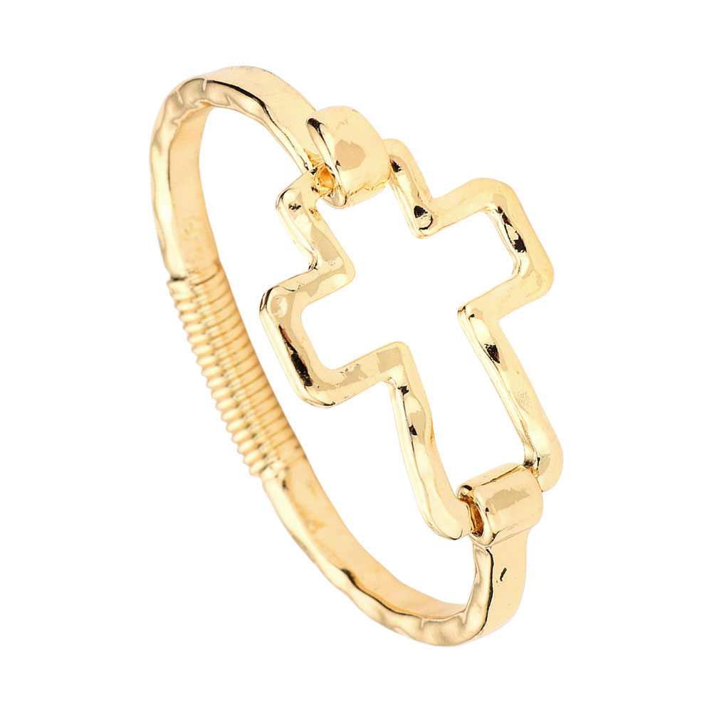 • This distinctive cuff bracelet features a bold open cross design and a lightly hammered finish for added texture. With its flexible spring closure and symbolic silhouette, it offers a unique blend of rustic charm and contemporary style for everyday wear.