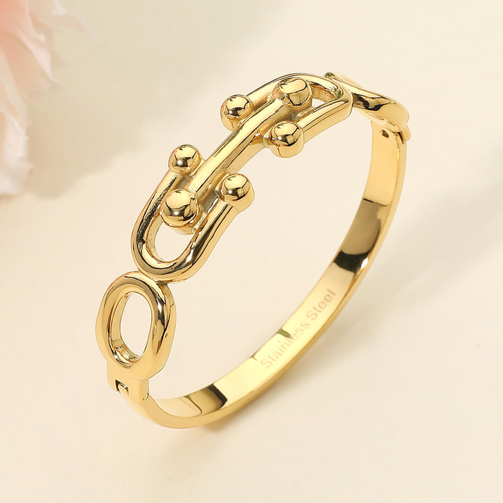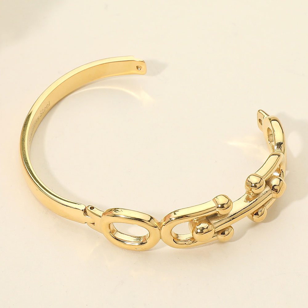 Details • Size : 0.7" H, 2.3" D • Hinged Closure • Bold hinged bracelet featuring sculpted chain link details with smooth rounded accents. Designed for easy on and off wear, this bracelet delivers a strong yet refined look that elevates everyday outfits. Ideal for stacking or wearing solo, it’s a versatile statement piece for modern accessory collections. • Stainless Steel