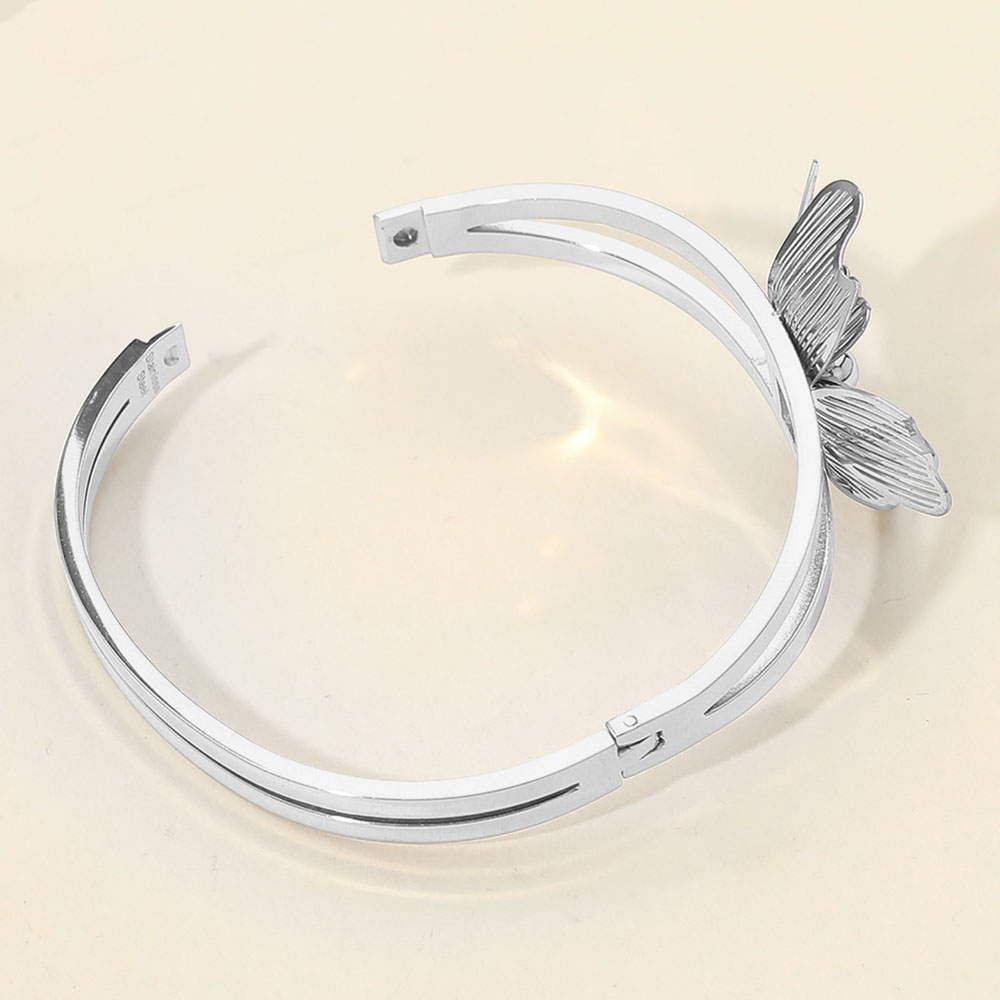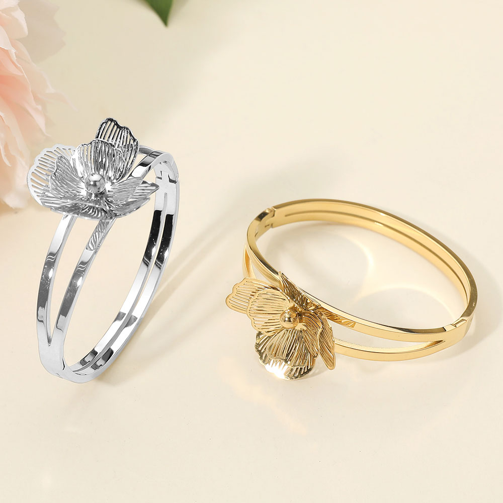 Details • Size : 1.25" H, 2.3" D • Hinged Closure • Elegant hinged bracelet featuring a sculpted floral design that adds dimension and refined style to any look. The hinged opening allows easy on and off while maintaining a secure, comfortable fit. A standout accessory ideal for boutique displays, gift selections, and fashion-forward collections seeking timeless yet distinctive appeal. • Stainless Steel