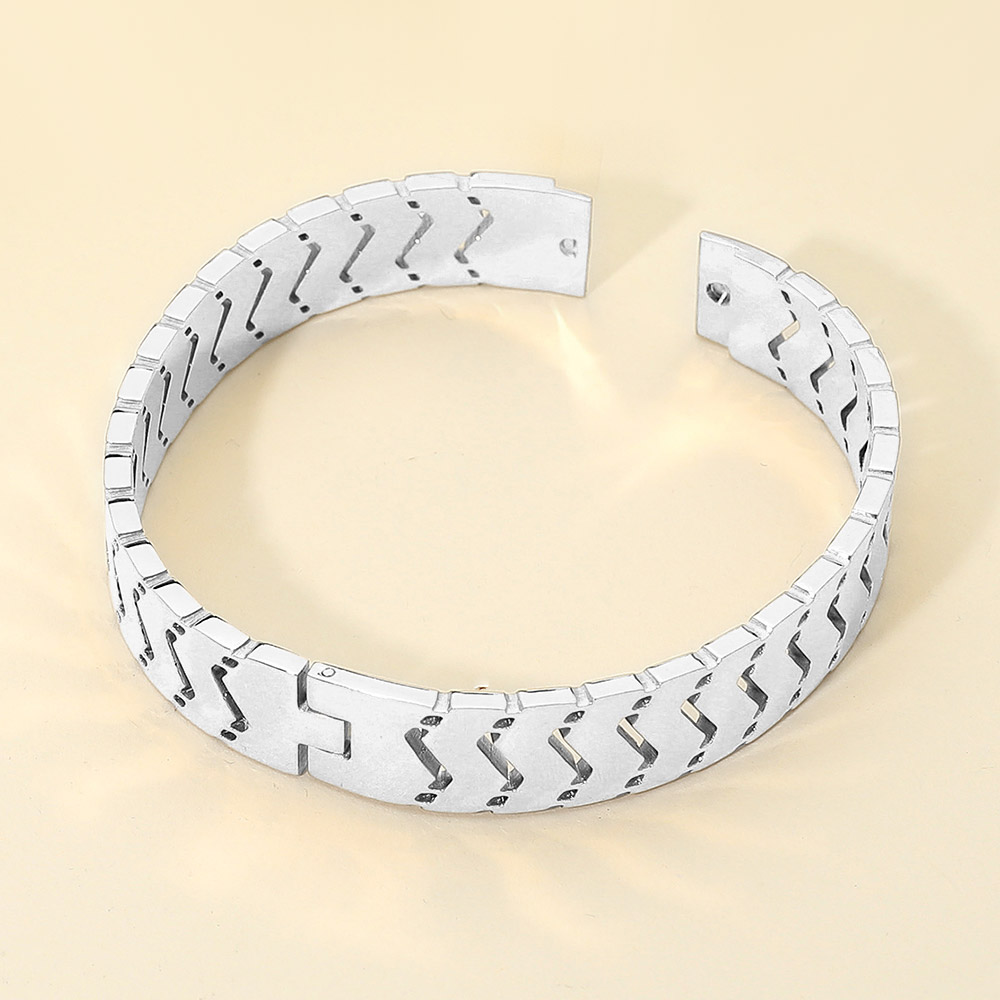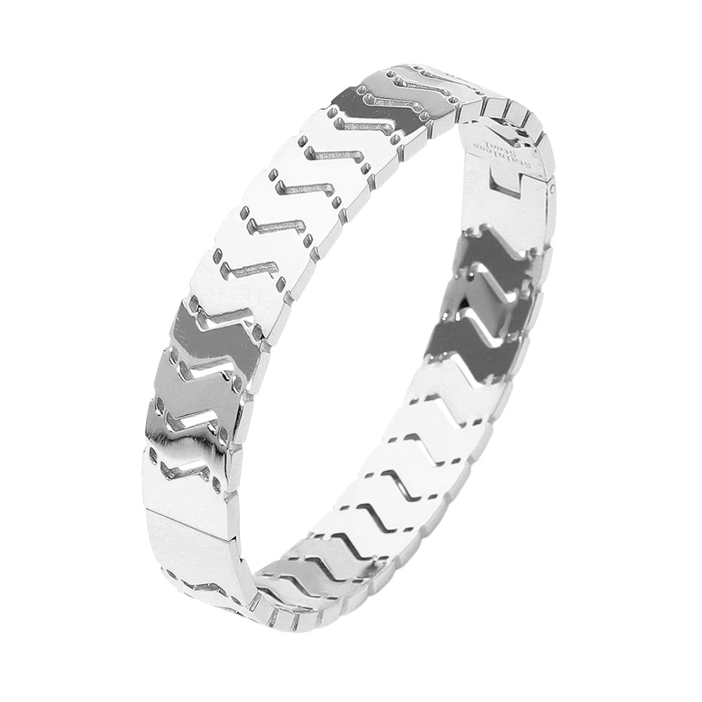 • This stainless steel bangle features a striking geometric link design that blends bold character with modern sophistication. Its polished finish enhances the intricate pattern, creating a statement accessory that stands out with confidence while maintaining a sleek, elegant allure.