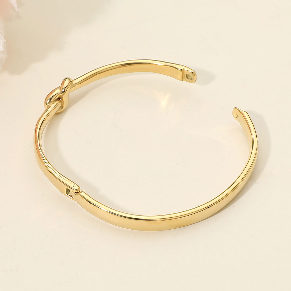 Details • Size : 0.4" H, 2.3" D • Hinged Closure • Sleek hinged bangle bracelet designed with a refined knot accent for a timeless, minimalist statement. Features an easy open-and-close hinge for comfortable wear and a secure fit. Ideal for everyday styling, stacking with other bracelets, or elevating boutique jewelry collections with a clean, modern silhouette. • Stainless Steel