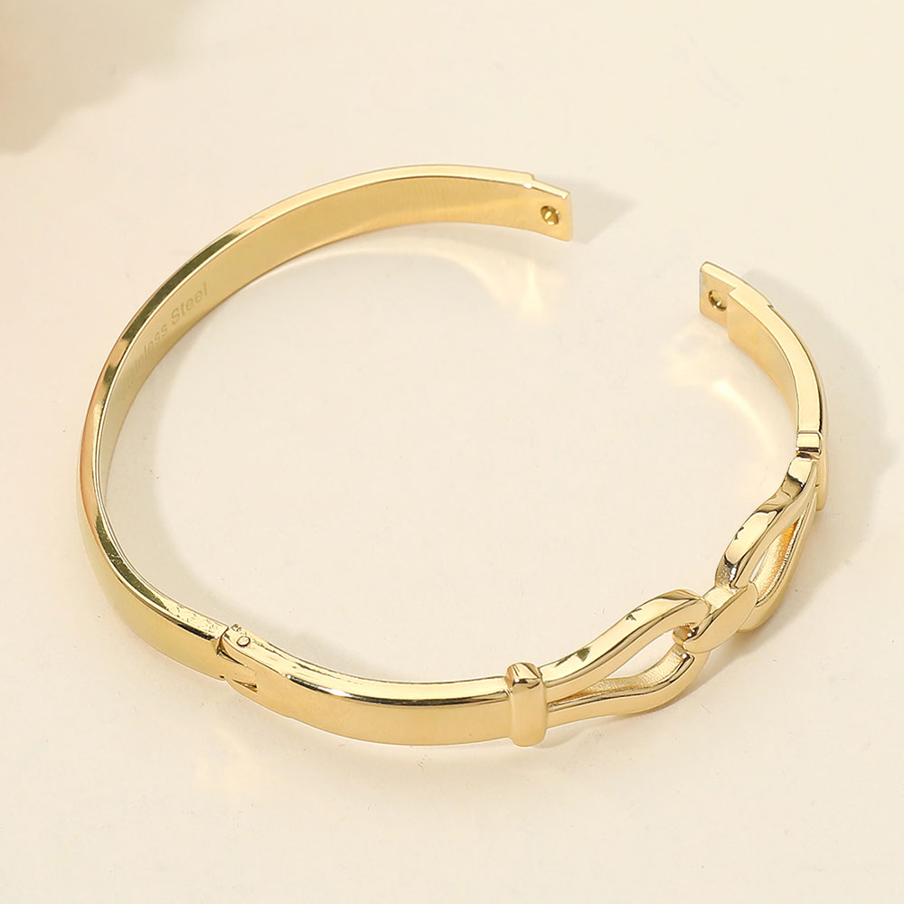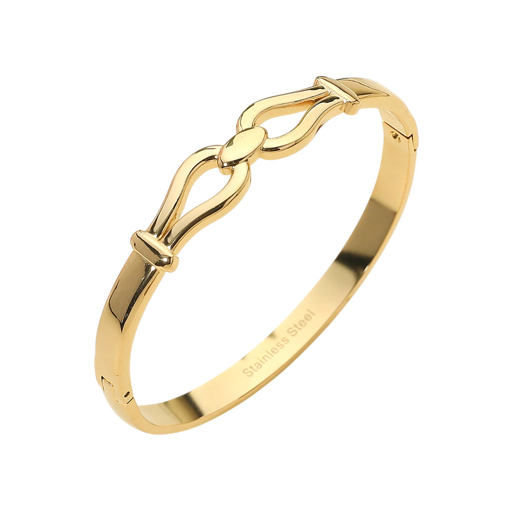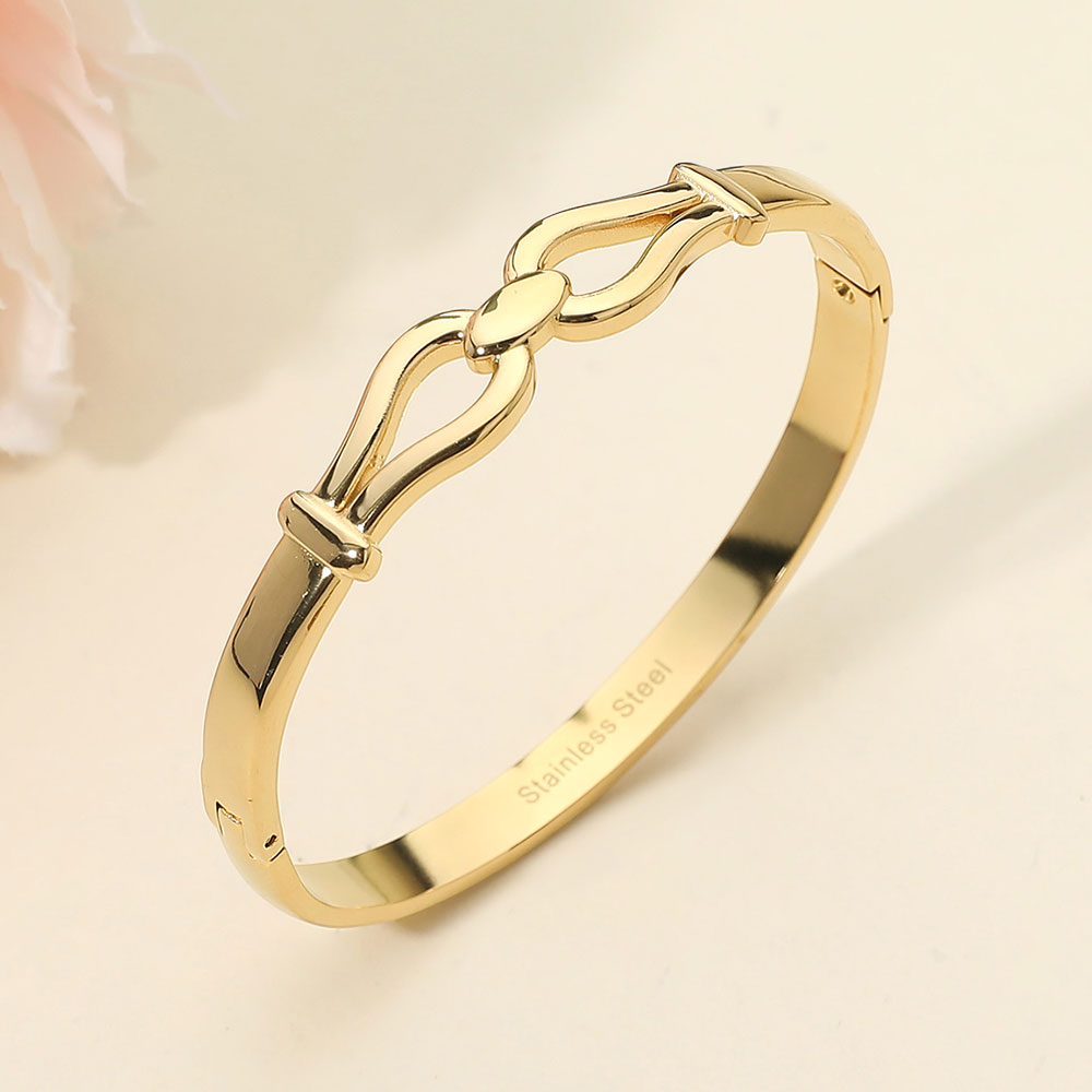 Details • Size : 0.4" H, 2.3" D • Hinged Closure • Sleek hinged bracelet featuring sculpted link detailing for a clean, contemporary look. Designed for easy wear with a secure hinged closure, this bracelet offers a polished silhouette that works perfectly alone or stacked. A versatile accessory ideal for everyday styling, gifting, and trend-focused retail collections. • Stainless Steel