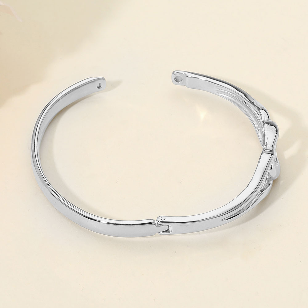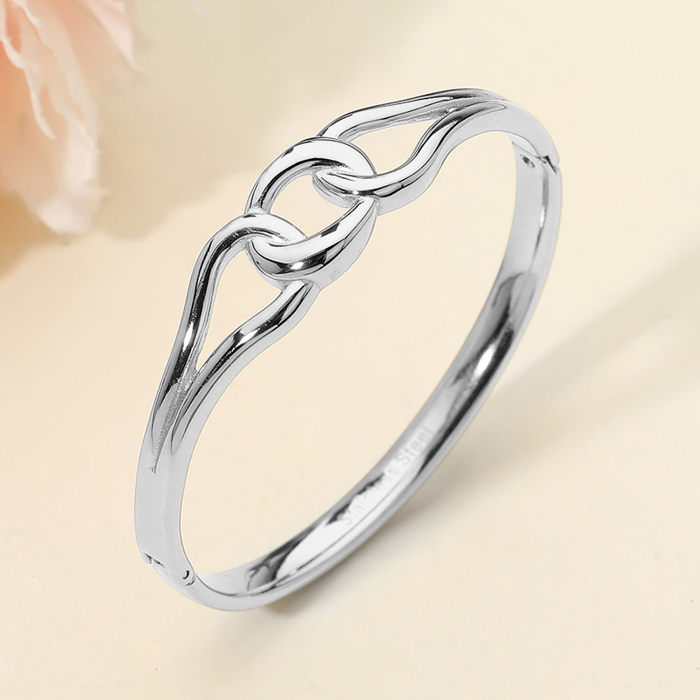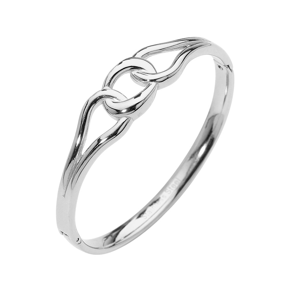 Details • Size : 0.5" H, 2.3" D • Hinged Closure • Sleek hinged bracelet featuring an elegant twisted link design that blends modern structure with timeless style. The hinged closure allows easy wear while maintaining a secure, comfortable fit. Ideal for everyday outfits or statement layering, this versatile bracelet is perfect for boutiques seeking polished, trend-forward accessories with broad customer appeal. • Stainless Steel