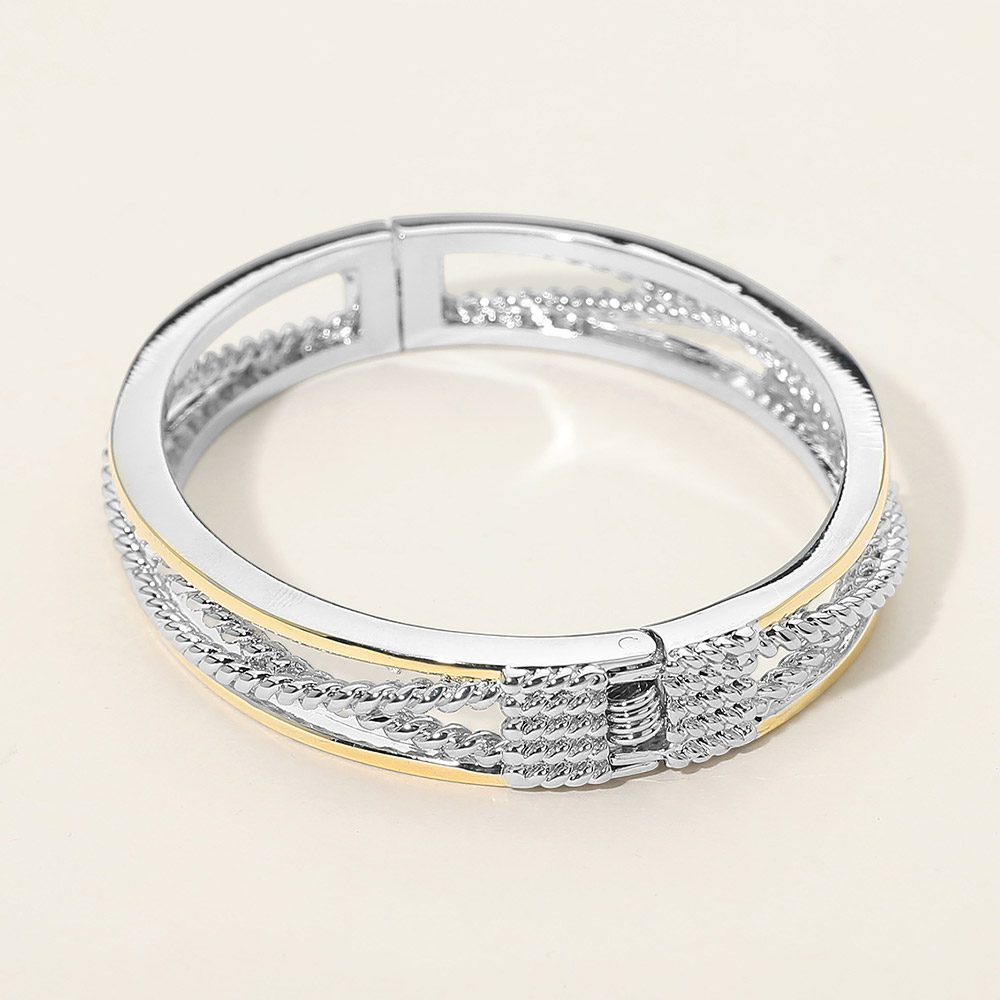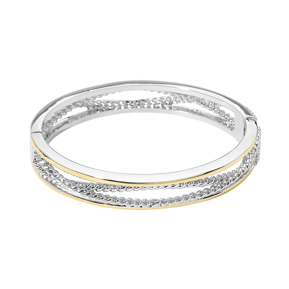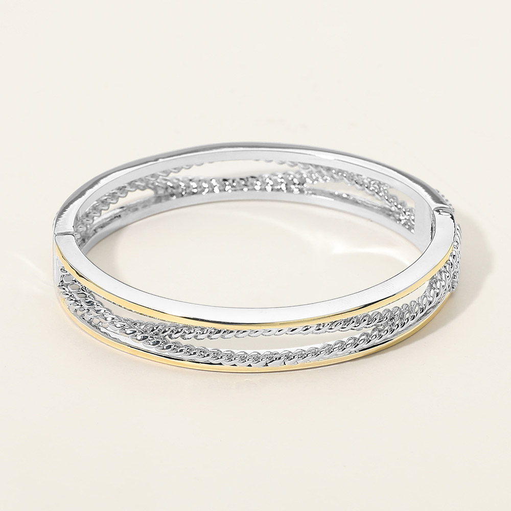 Details • Size : 0.4" H, 2.4" D • Hinged Closure • Elegant hinged bangle bracelet featuring layered rope-inspired textures and a sleek, polished silhouette for a refined everyday look. Designed for a secure, comfortable fit, it works beautifully worn alone or stacked with other styles. A versatile jewelry essential ideal for boutiques seeking timeless, modern accessories.