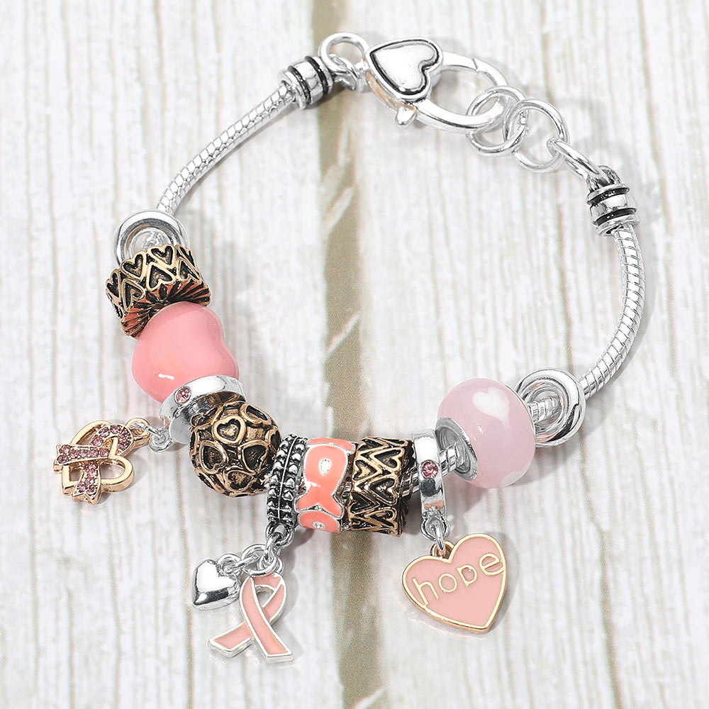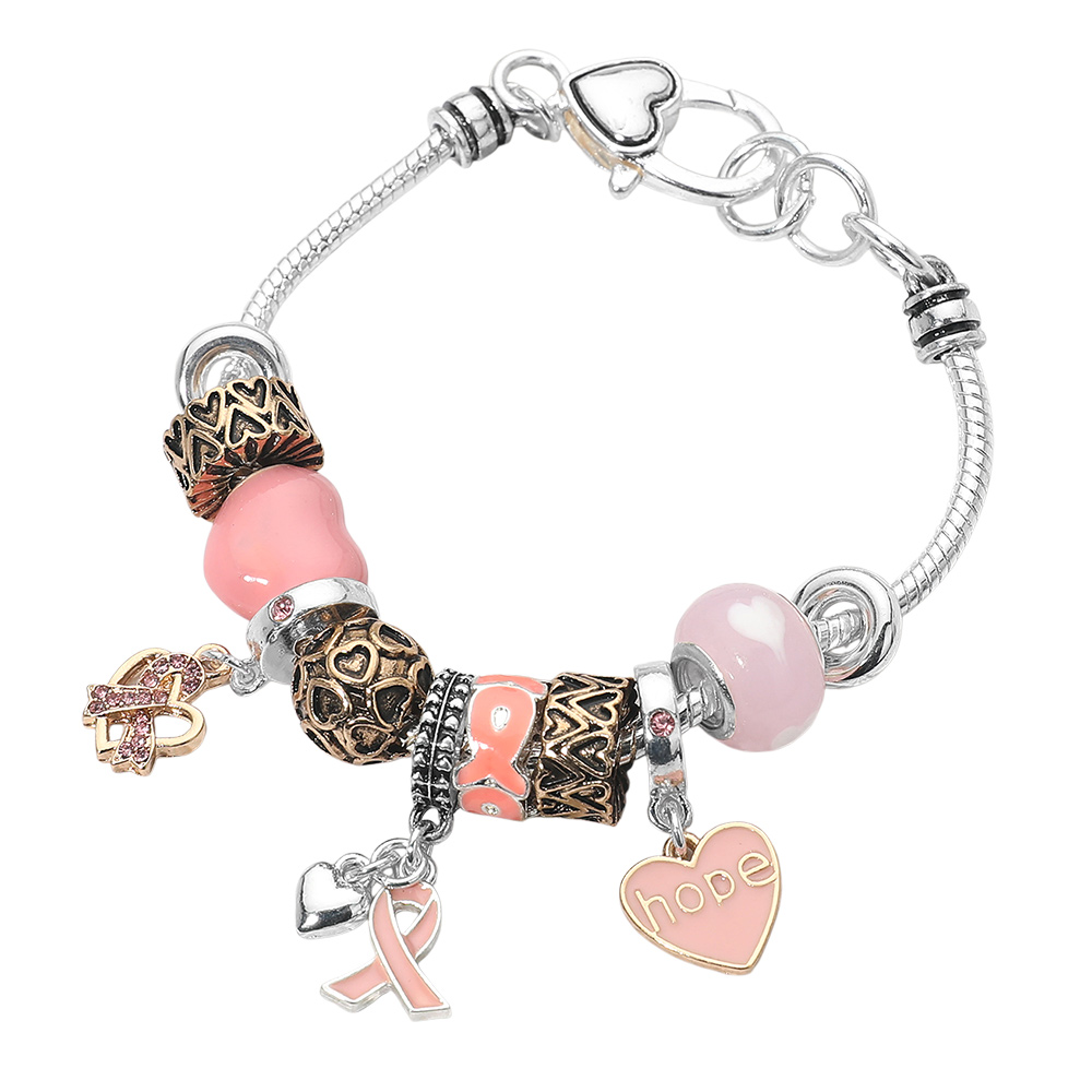 Details • Size : 1" H, 7.5" + 1" L • Lobster Clasp Closure • Meaningful charm bracelet designed with awareness ribbon details, heart charms, and symbolic accents representing strength and hope. A thoughtful accessory for showing support, gifting with purpose, or adding an inspirational touch to everyday outfits and layered bracelet looks. • Lead and Nickel Compliant