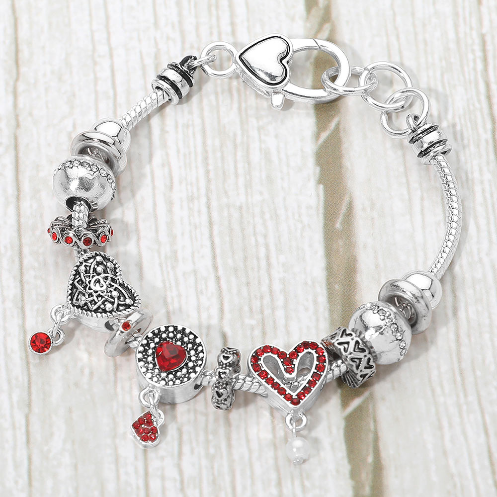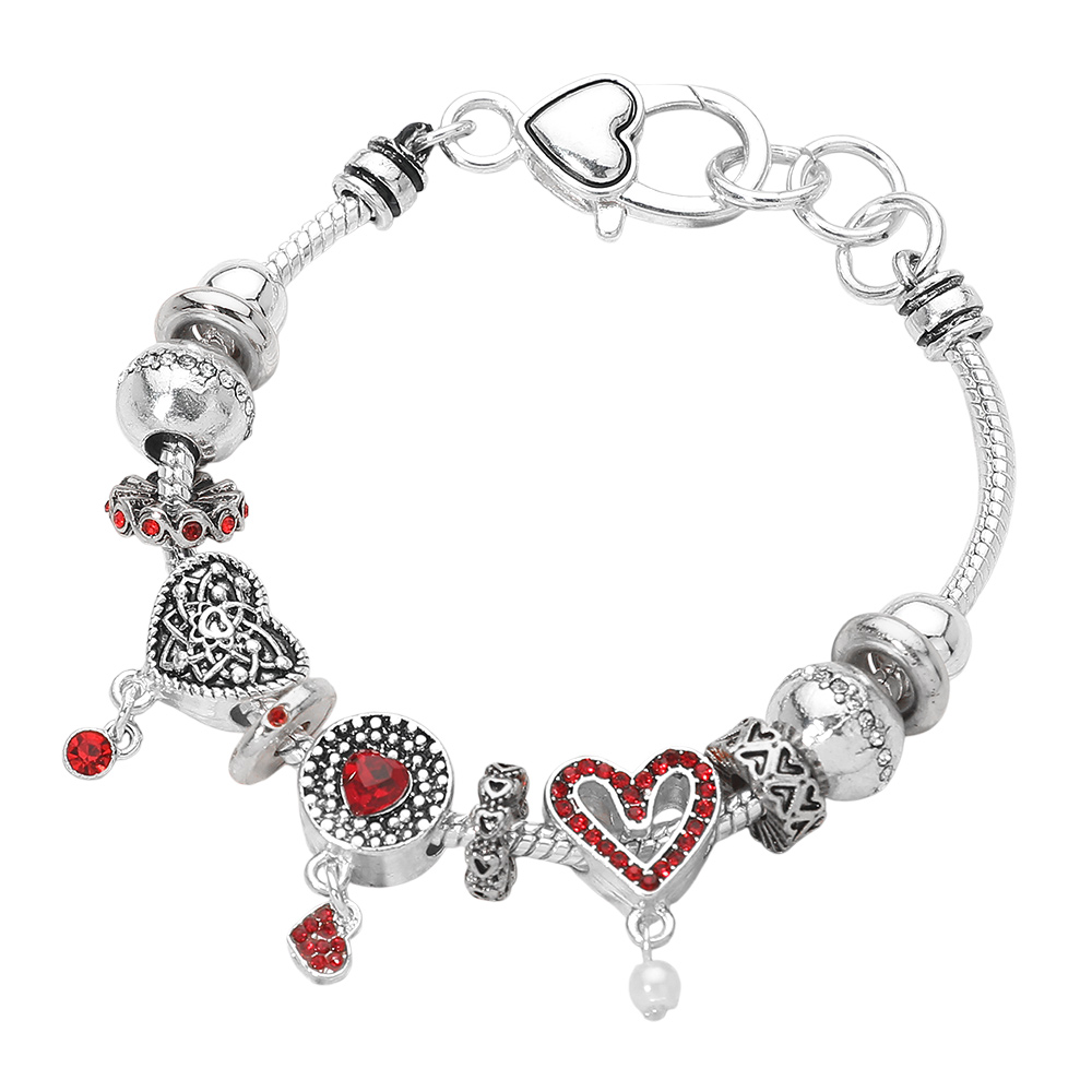 Details • Size : 0.85" H, 7" + 1" L • Lobster Clasp Closure • Elegant charm bracelet adorned with intricate heart-shaped pendants and detailed beadwork. A romantic accessory that adds a touch of whimsy and charm to any outfit, perfect for special occasions or daily wear. • Lead and Nickel Compliant