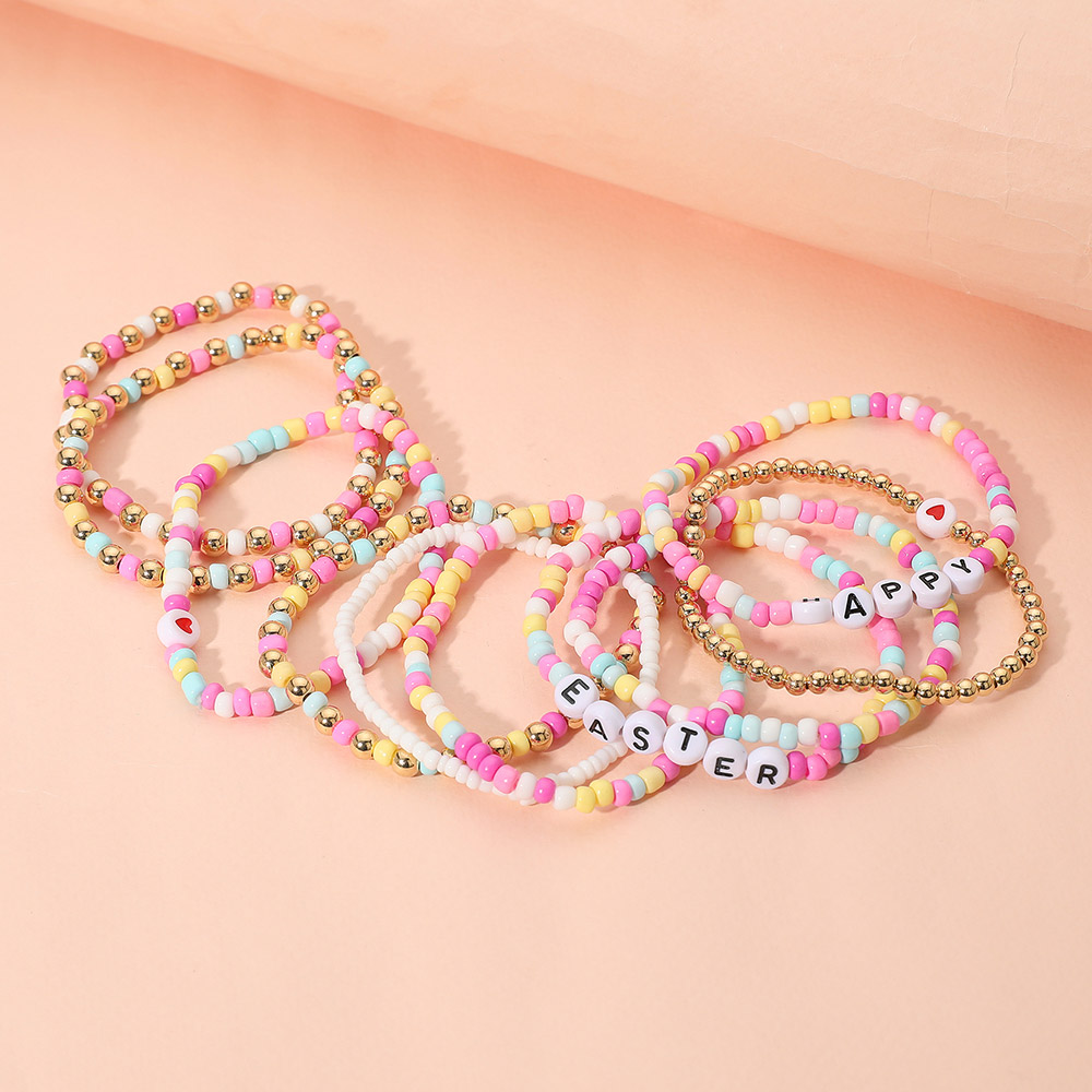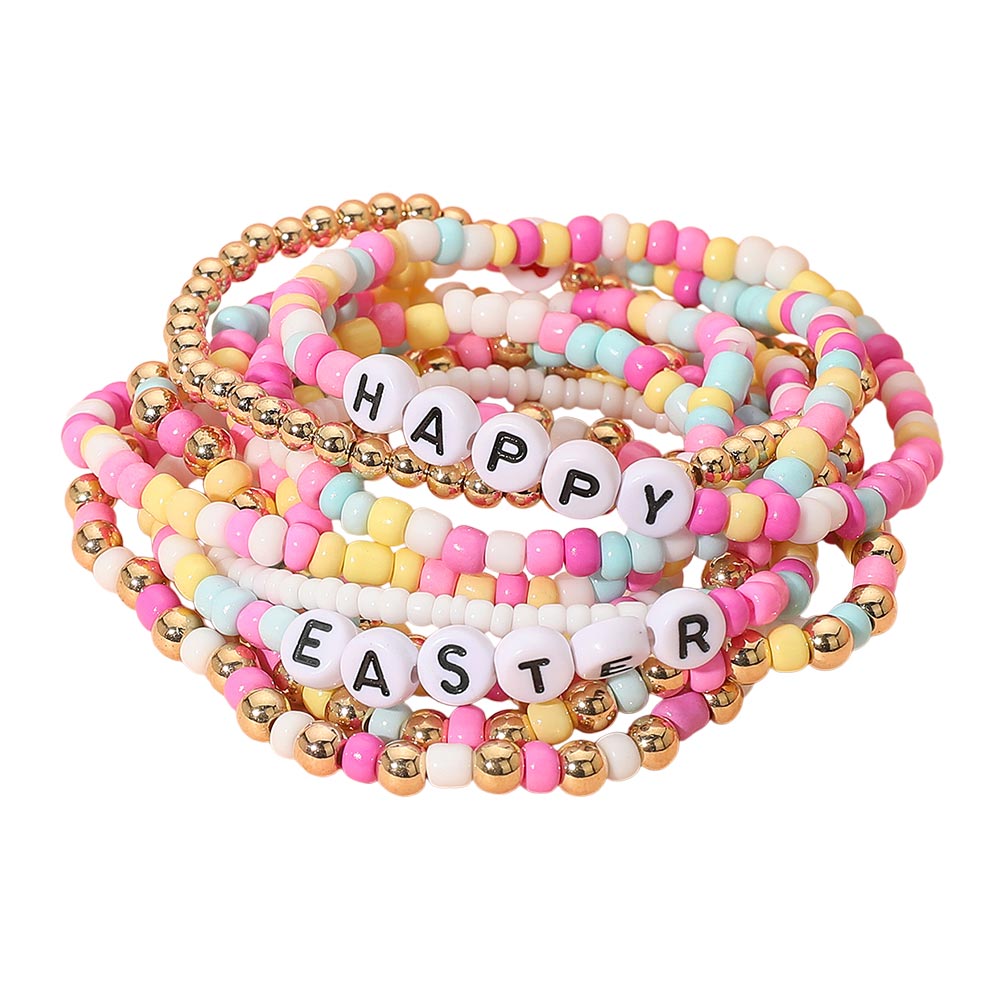Details • Size : 1.75" H • Stretchable • Festive beaded stretch bracelet set featuring multiple strands with playful letter accents spelling “HAPPY EASTER.” Designed with a mix of smooth beads and metallic accents, this stackable set adds a cheerful seasonal touch to everyday outfits and holiday celebrations. • Lead and Nickel Compliant