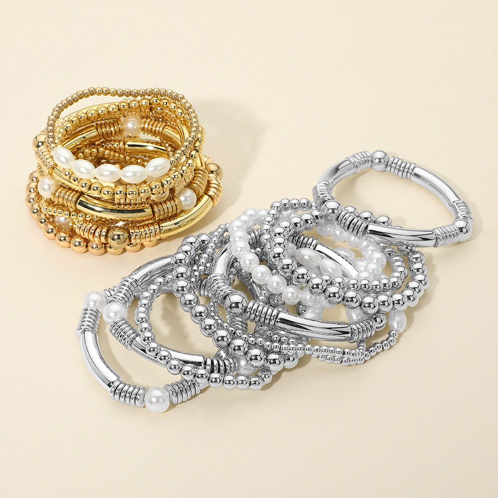 11PCS - Bold Pearl Metal Beaded Stretch Multi Layered Bracelets