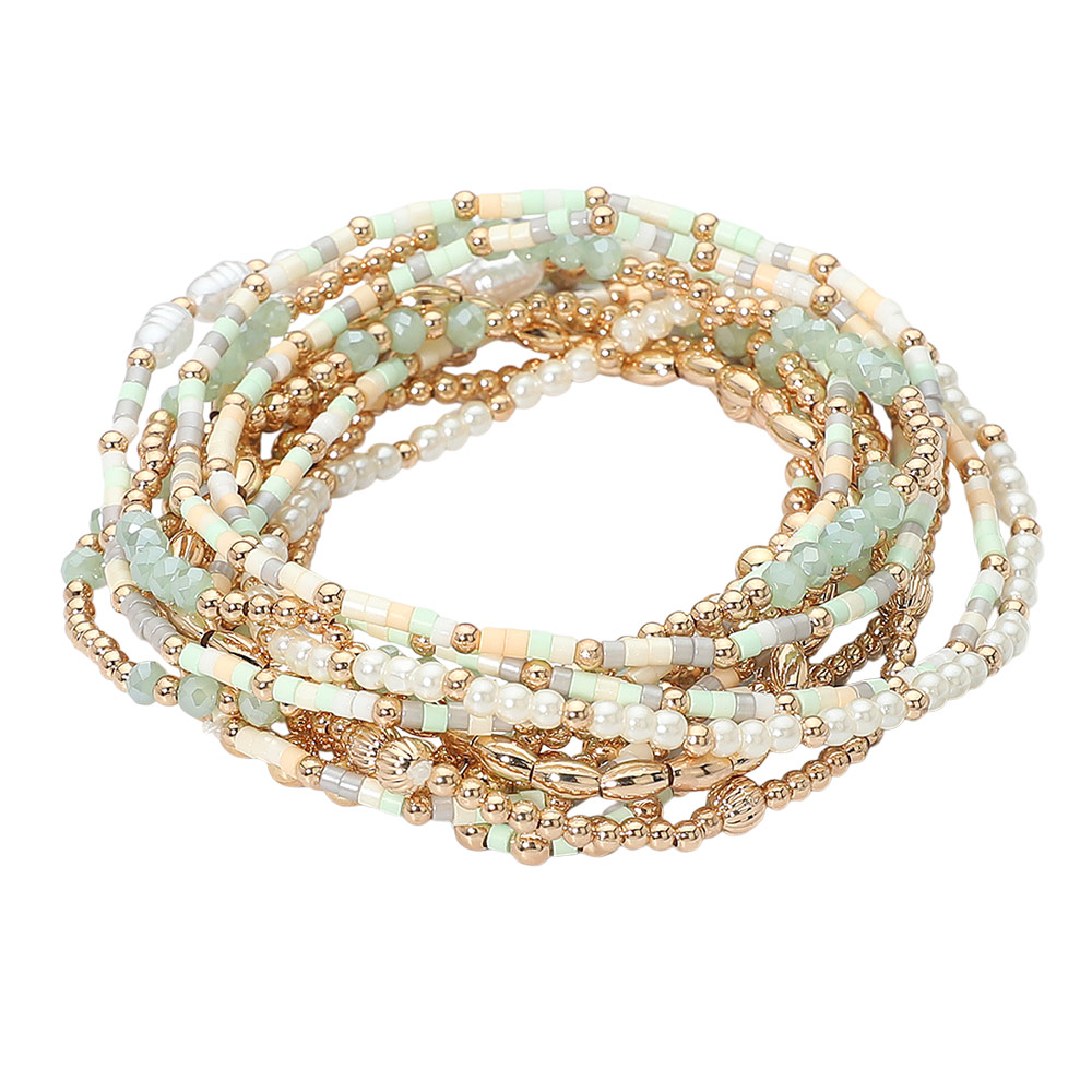 12PCS - Pearl Metal Ball Seed Faceted Beaded Stretch Multi Layered Bracelets