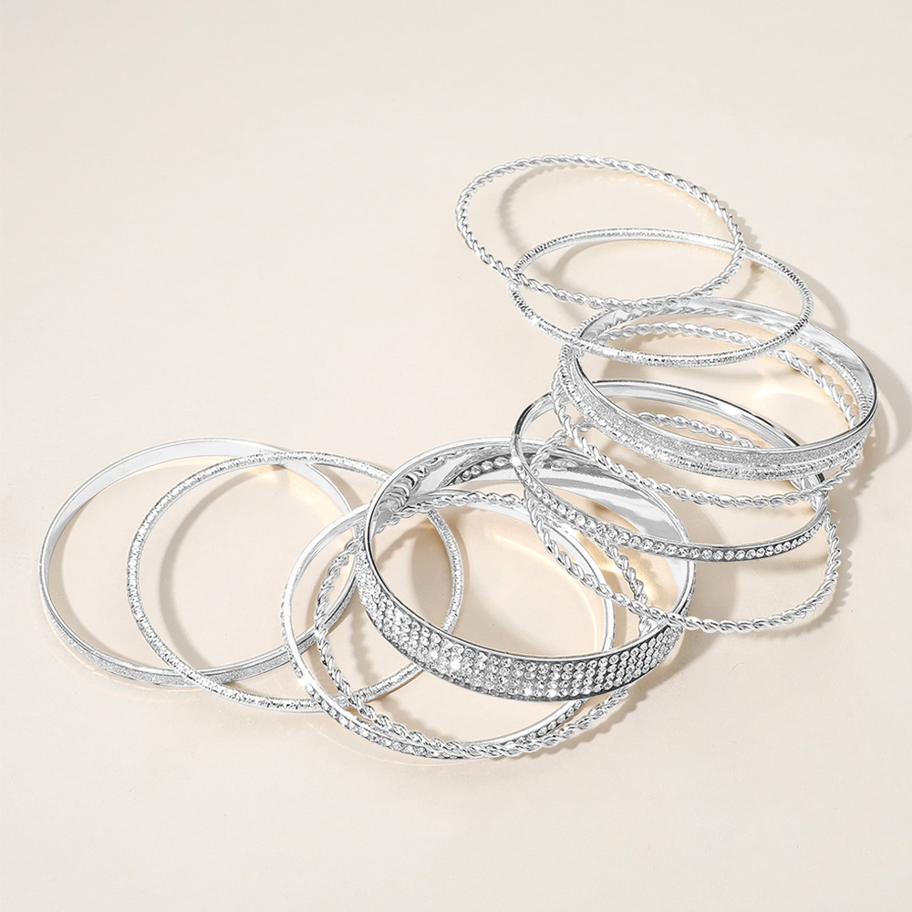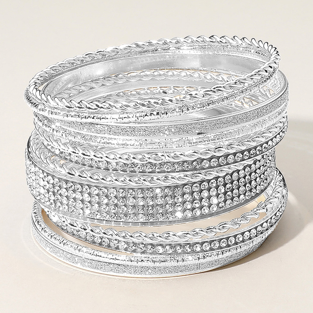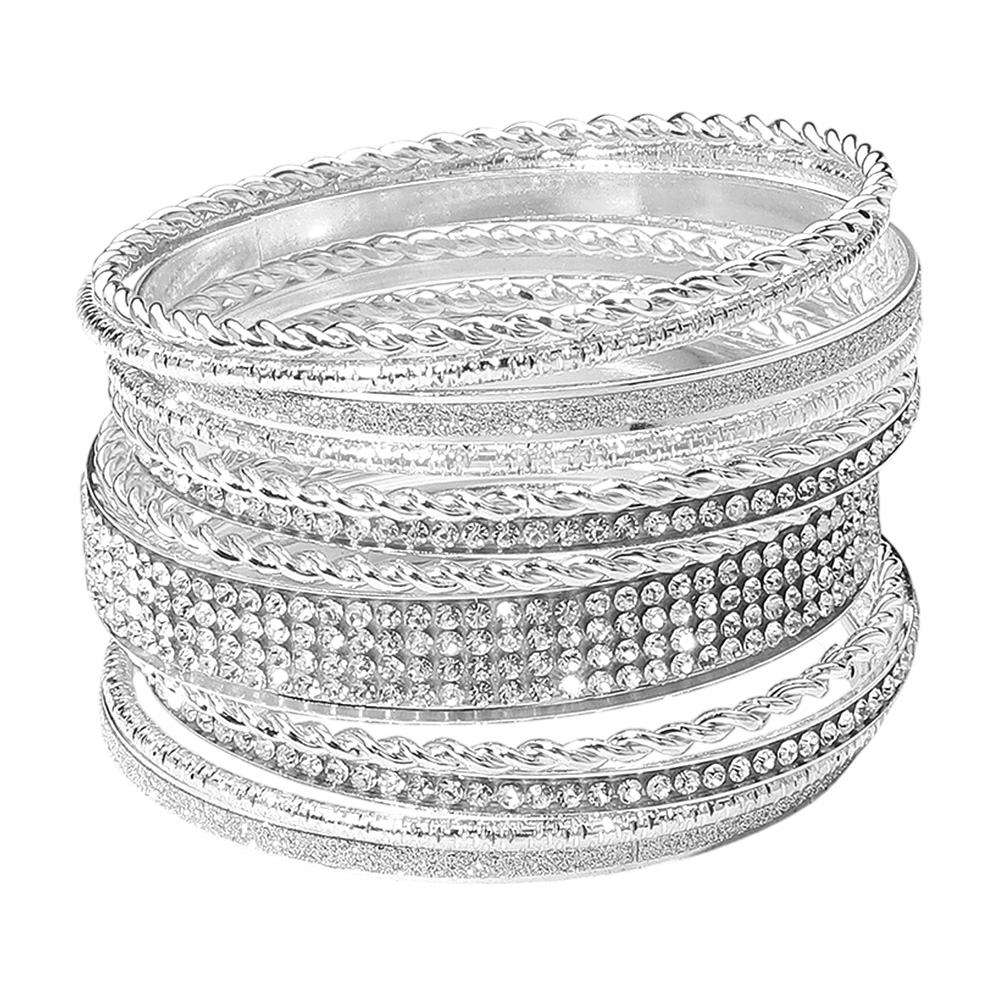 12PCS - Rhinestone Paved Glittered Twisted Textured Metal Bangle Stackable Multi Layered Bracelets