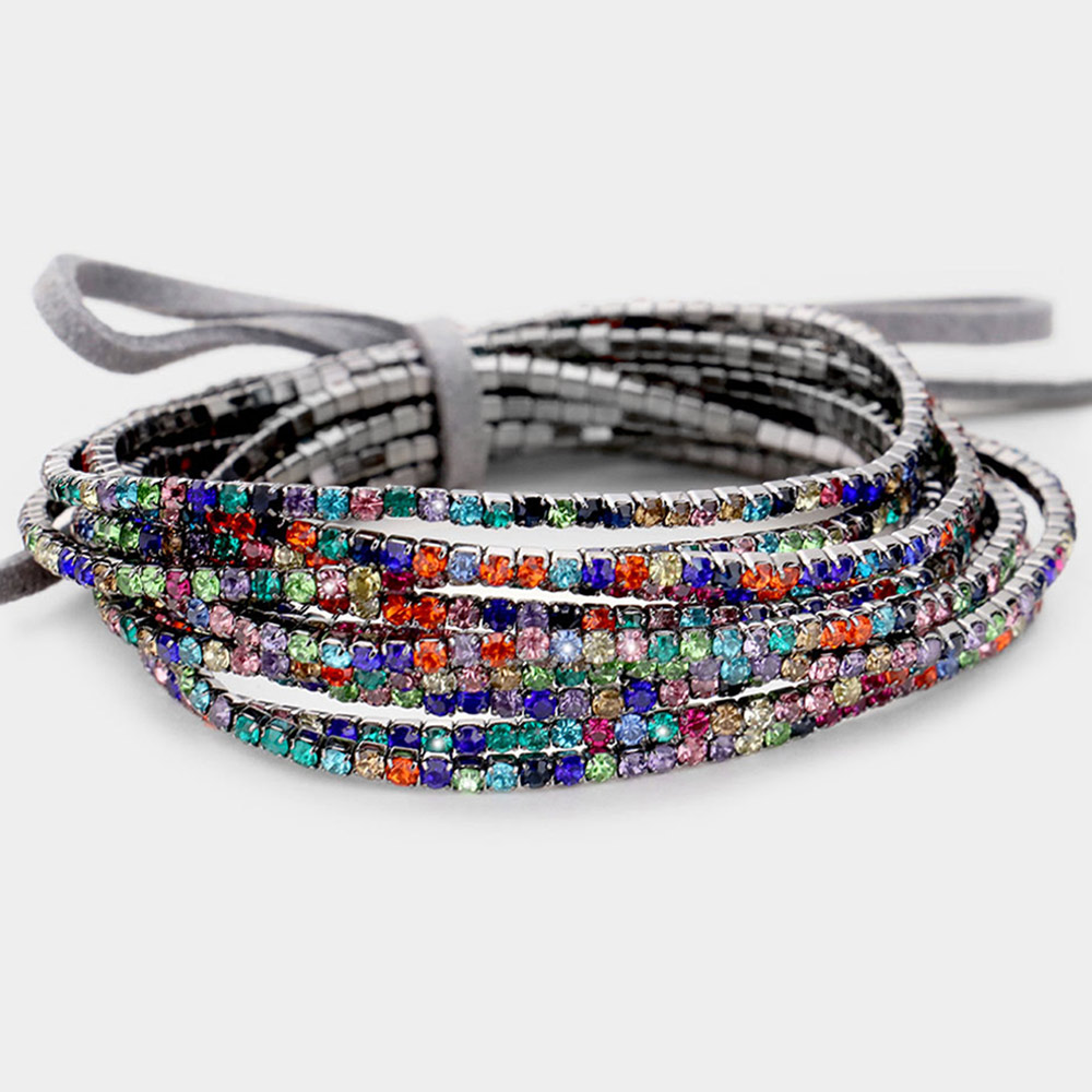 • Colorful wrap bracelet featuring multiple strands with shimmering bead accents and an adjustable tie closure. A playful accessory perfect for casual and festive looks.