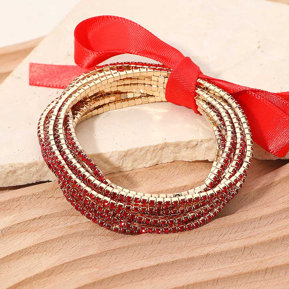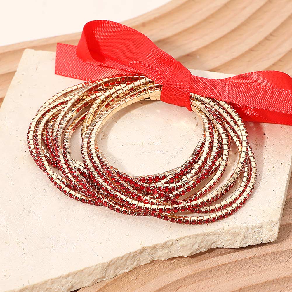 • Elegant layered stretch bracelet set featuring multiple slim bands tied together with a decorative ribbon. The stackable circular design adds texture and shine, perfect for both casual layering and festive occasions.