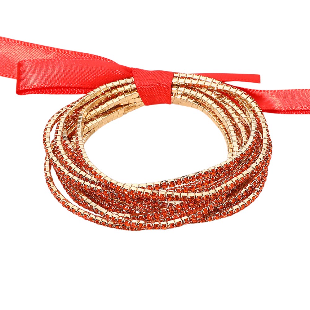 • Elegant layered stretch bracelet set featuring multiple slim bands tied together with a decorative ribbon. The stackable circular design adds texture and shine, perfect for both casual layering and festive occasions.
