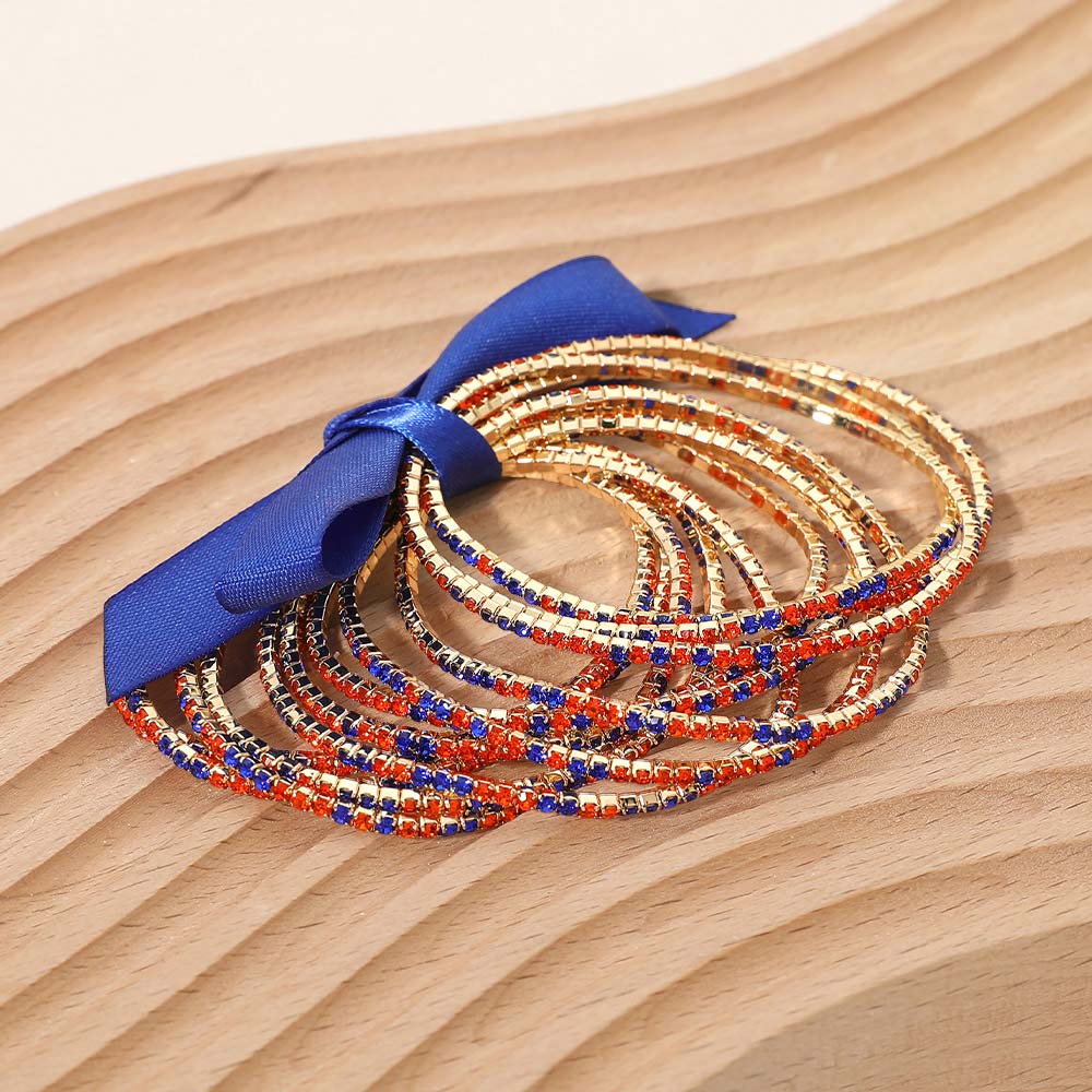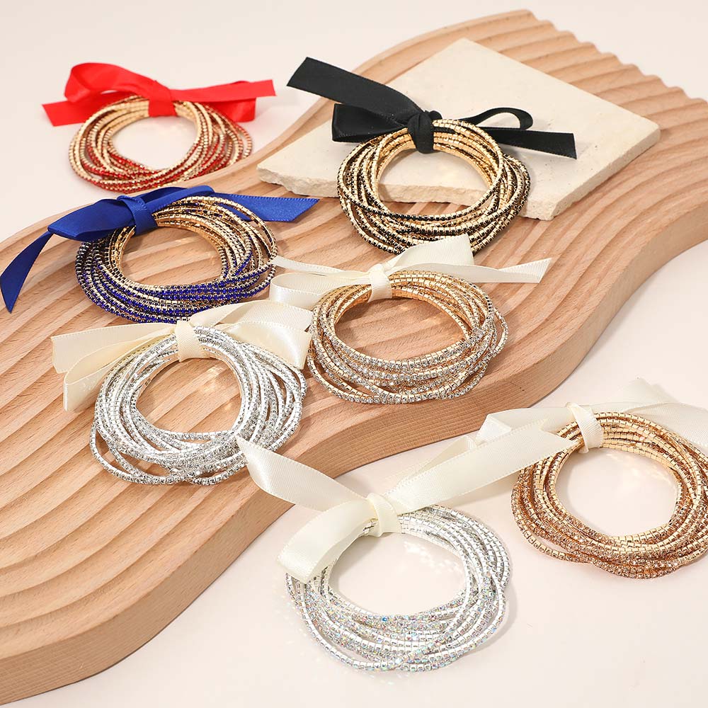 • Elegant layered stretch bracelet set featuring multiple slim bands tied together with a decorative ribbon. The stackable circular design adds texture and shine, perfect for both casual layering and festive occasions.