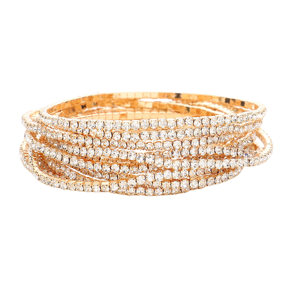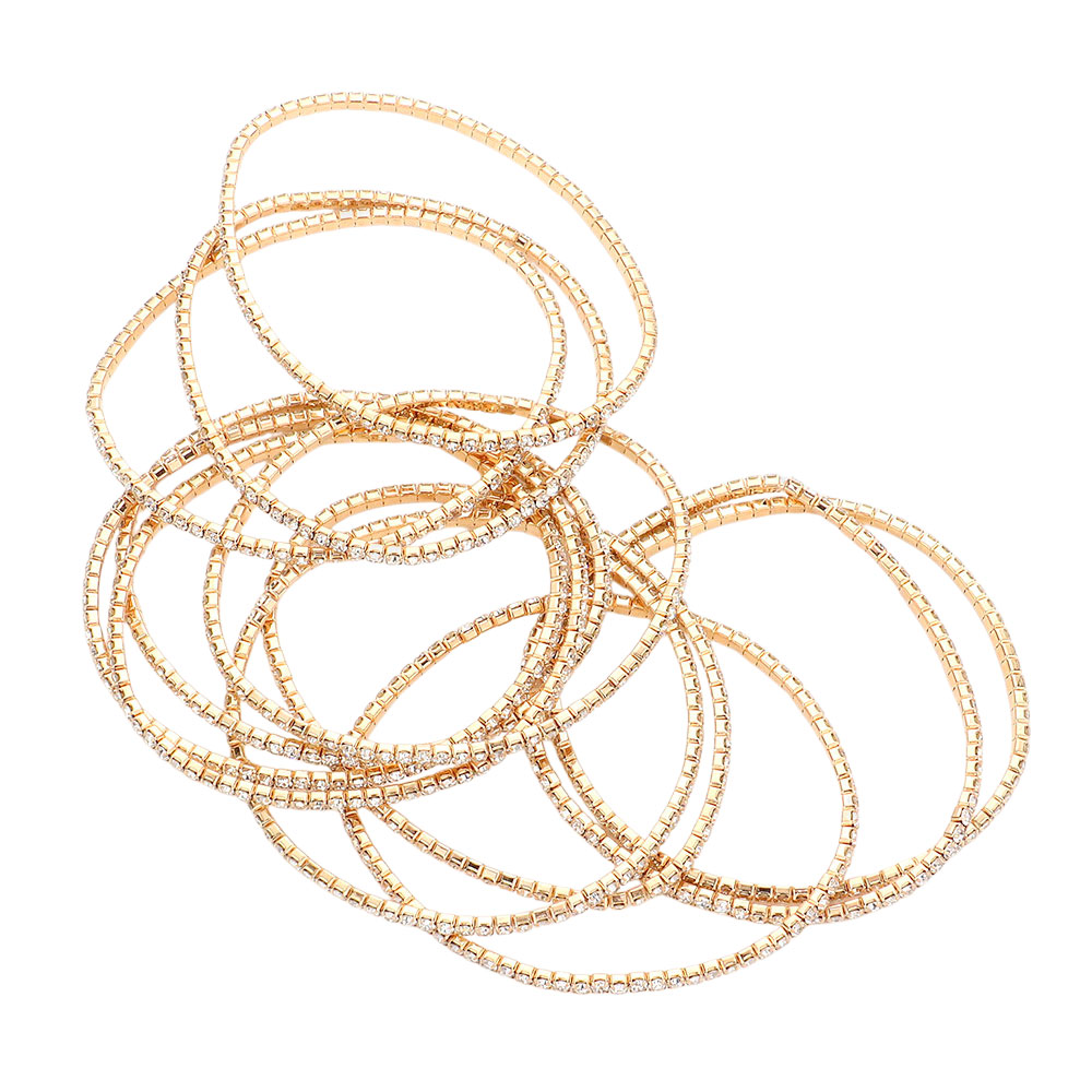 Details • Size : 1.2" H • Stretchable • Complete your look with this set of 12 stackable stretch bracelets. Sleek and versatile, these lightweight stretch bangles feature a shimmering design that layers beautifully for casual or dressy outfits, offering endless styling possibilities with modern elegance.
