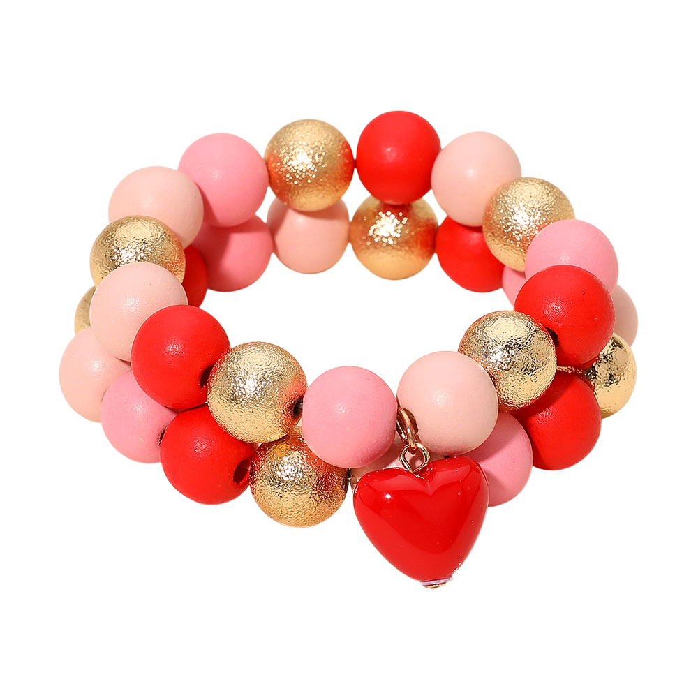 2PCS - Chunky Heart Charm Wooden Metal Ball Beaded Stretch Multi Layered Bracelets