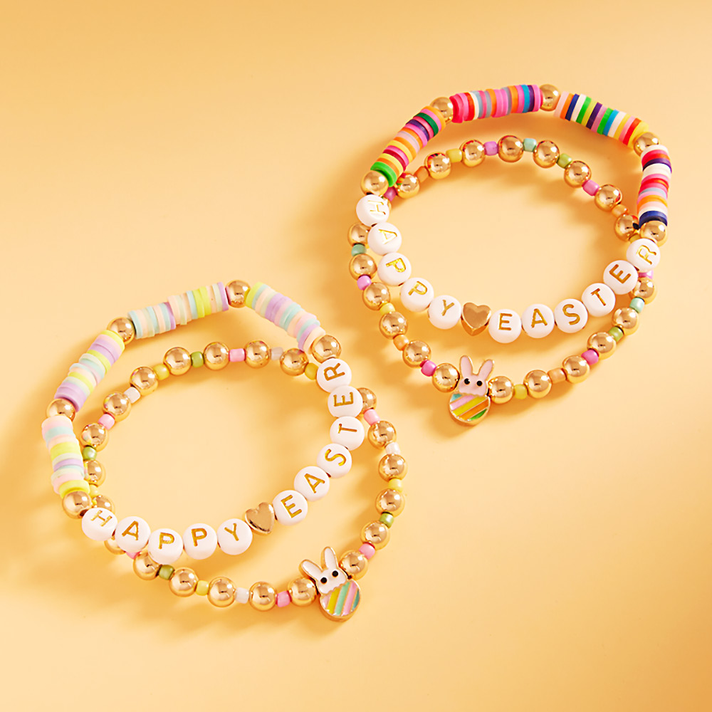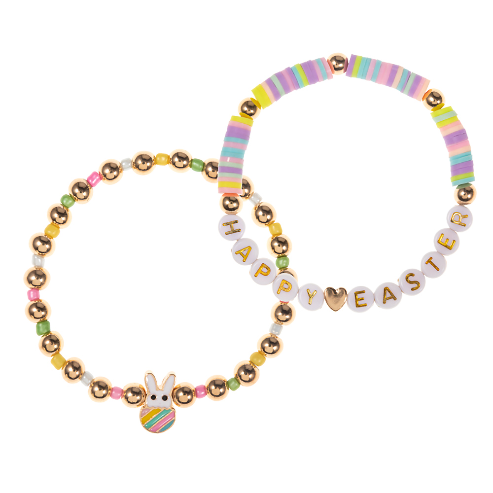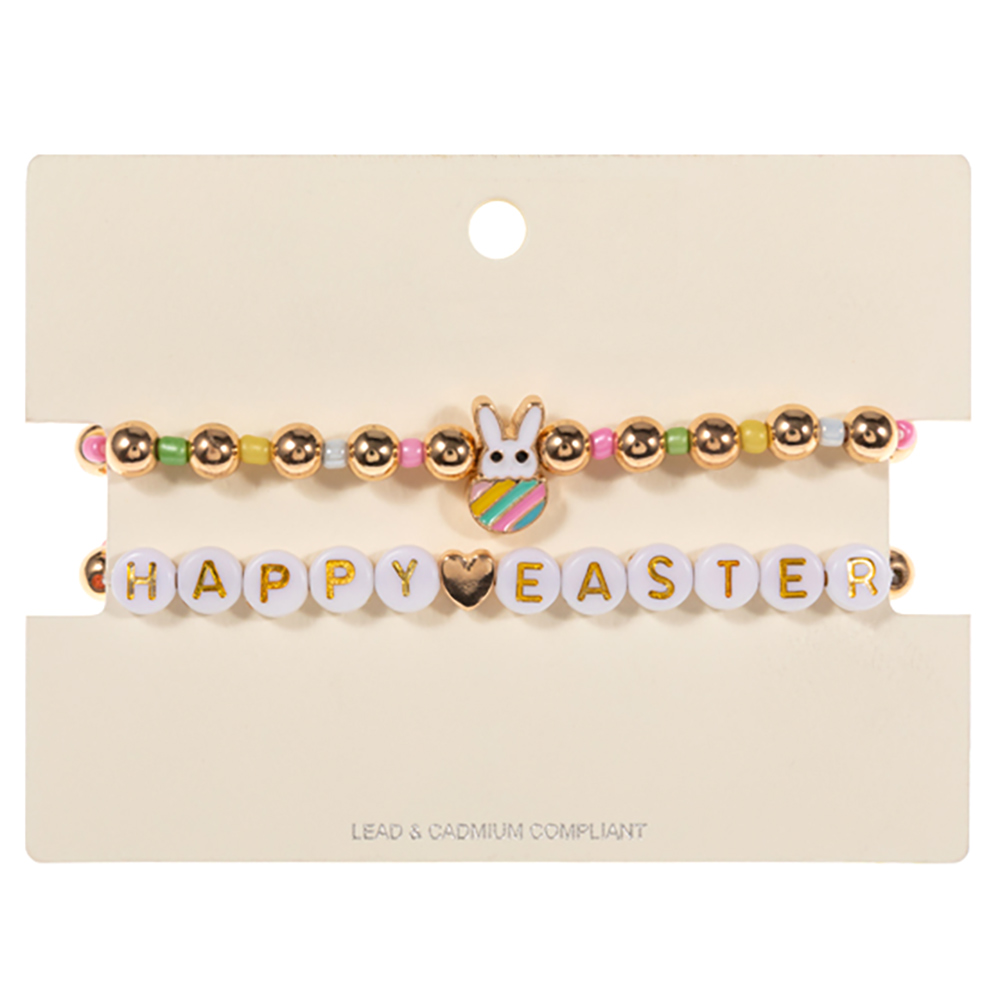 2PCS - Enamel Easter Bunny Pointed HAPPY EASTER Message Metal Ball Heishi Beaded Stretch Multi Layered Bracelets