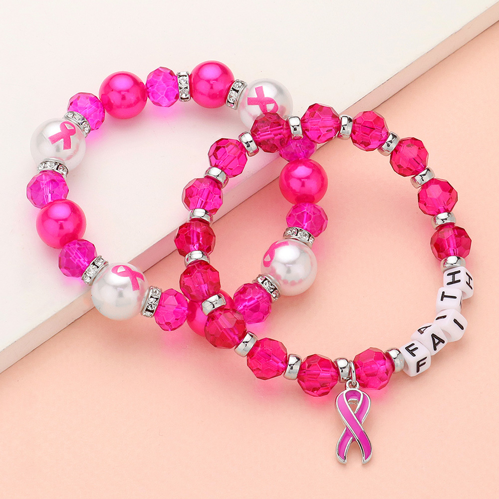 Details • Size : 1.6" H • Stretchable • Show your support with this “Faith” breast cancer awareness bracelet, featuring shimmering faceted beads, charm accents, and a meaningful ribbon symbol. Designed for comfort and impact, this stretch bracelet is a stylish reminder of courage, strength, and hope. • Lead and Nickel Compliant