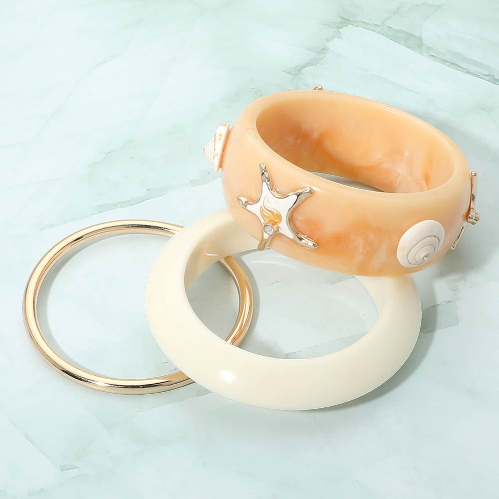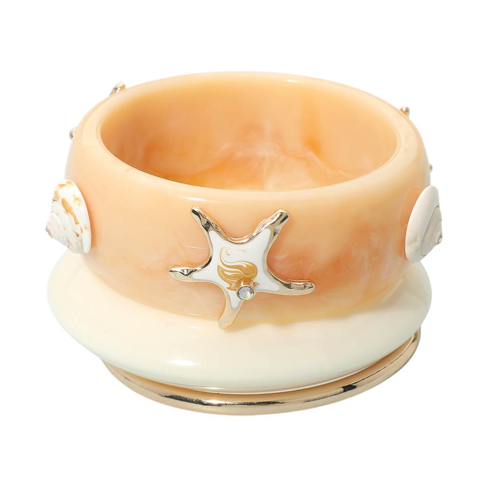 Details • Size : 2" H, 2.5" D • This starfish accent bangle bracelet delivers a bold, coastal-inspired statement with a smooth sculpted silhouette and raised decorative details. Designed for easy slip-on wear, it elevates resort outfits, summer looks, and vacation styling. A standout accessory for beach boutiques, seasonal collections, and gift-ready jewelry displays. • Lead and Nickel Compliant