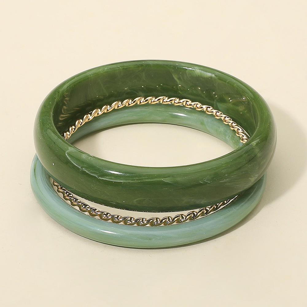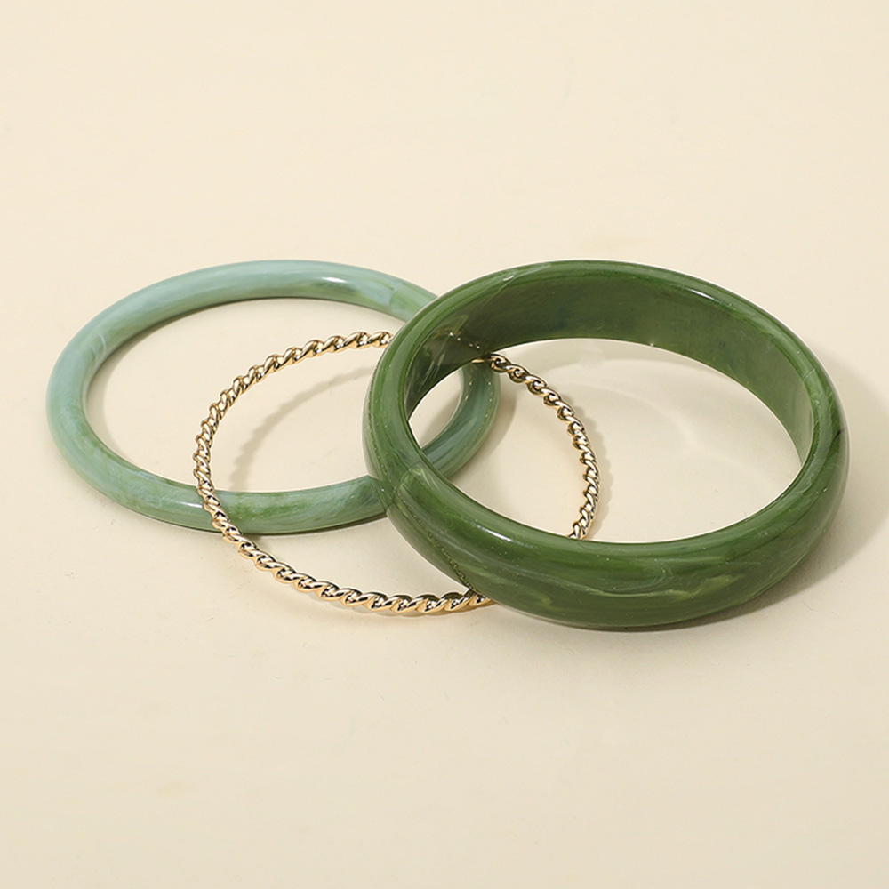 • Elegant 3-piece bangle bracelet set featuring smooth resin textures and a twisted metallic accent. Designed for versatile styling, this layered set can be stacked together or worn separately, adding a refined touch to both casual and dressy outfits.