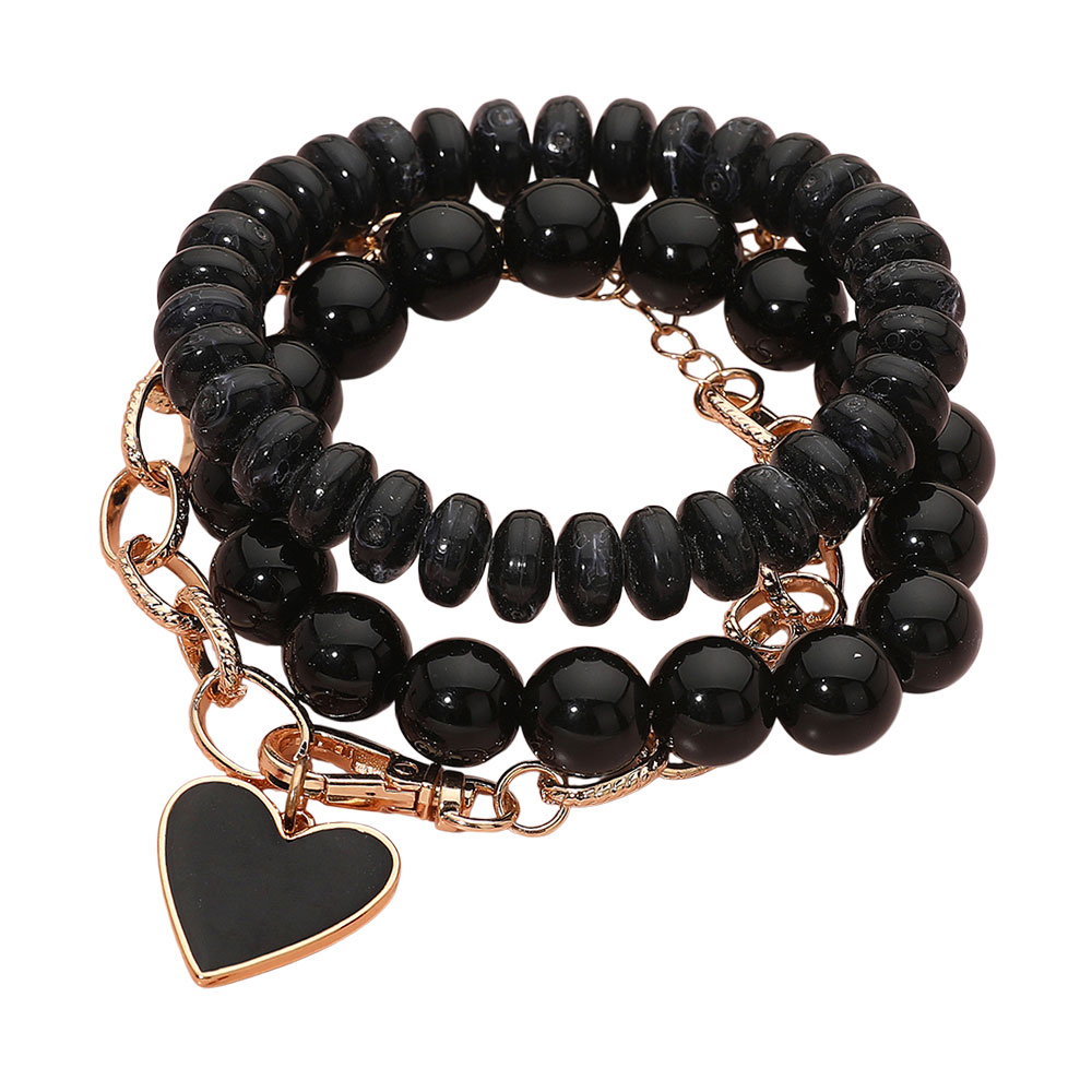 3PCS - Enamel Heart Charm Chain Stretch Beaded Multi Layered Bracelets