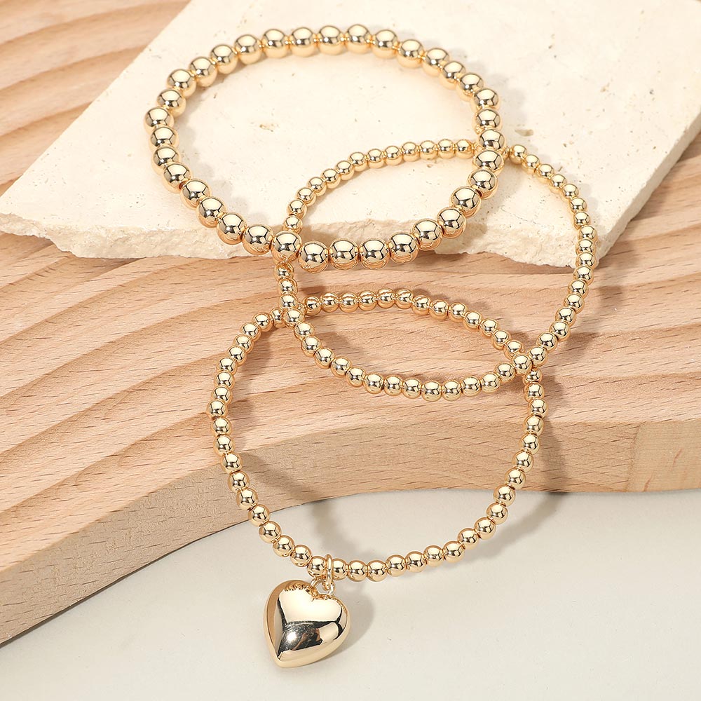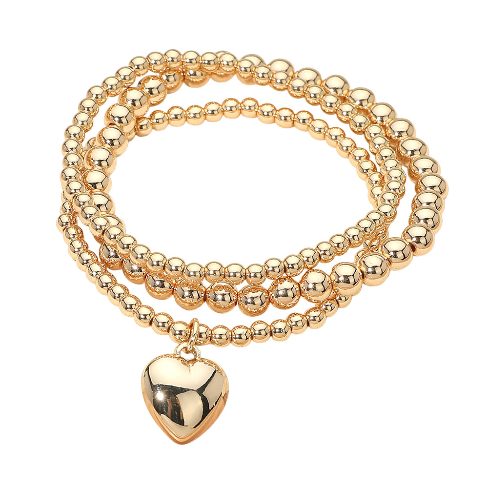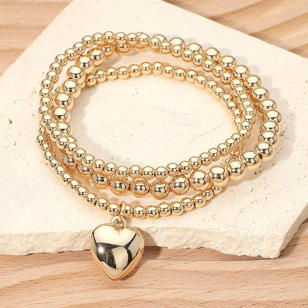 3PCS - Heart Charm Accent Beaded Stretch Multi Layered Bracelets
