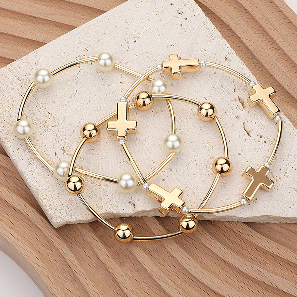 3PCS - Metal Cross Ball Pearl Station Stretch Multi Layered Bracelets