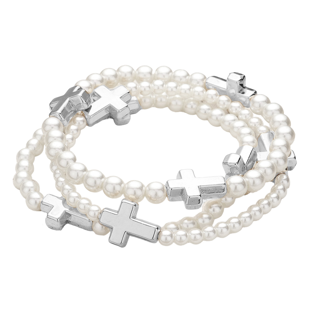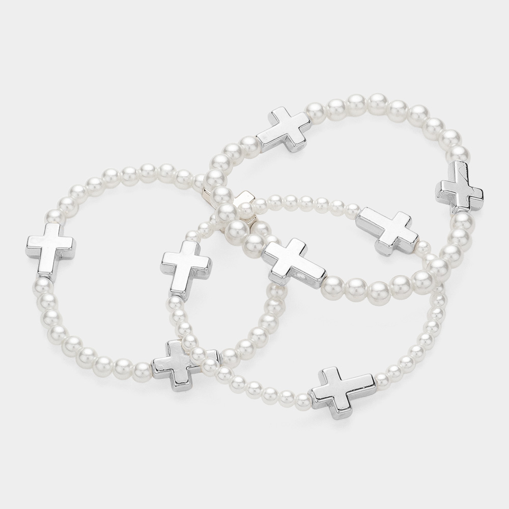 3PCS - Cross Floral Charm Pearl Metal Ball Faceted Beaded Stretch Multi Layered Bracelets