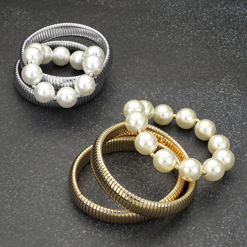 • Enhance your jewelry collection with this pearl and metallic stretch bracelet set, featuring luminous pearls paired with sleek metallic bands. Designed for comfort and style, this versatile bracelet set transitions effortlessly from casual outfits to formal occasions with timeless sophistication.