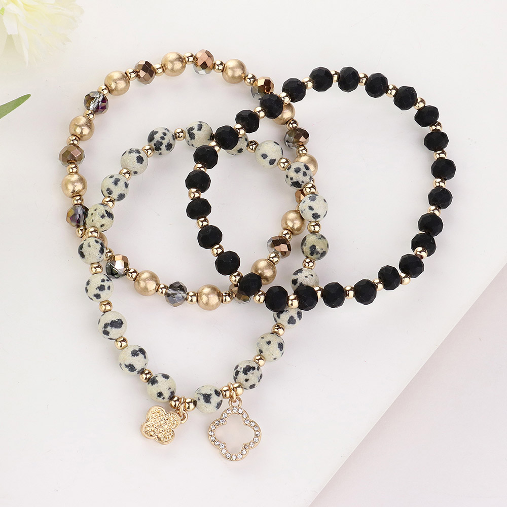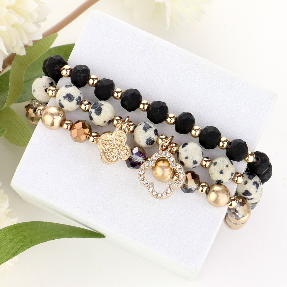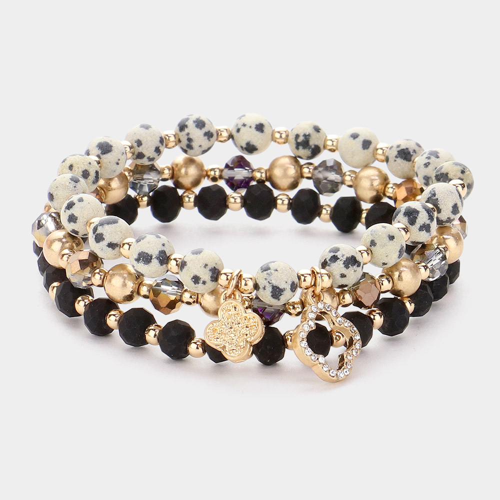 3PCS - Quatrefoil Charm Faceted Beads Natural Stone Beaded Stretch Multi Layered Bracelets
