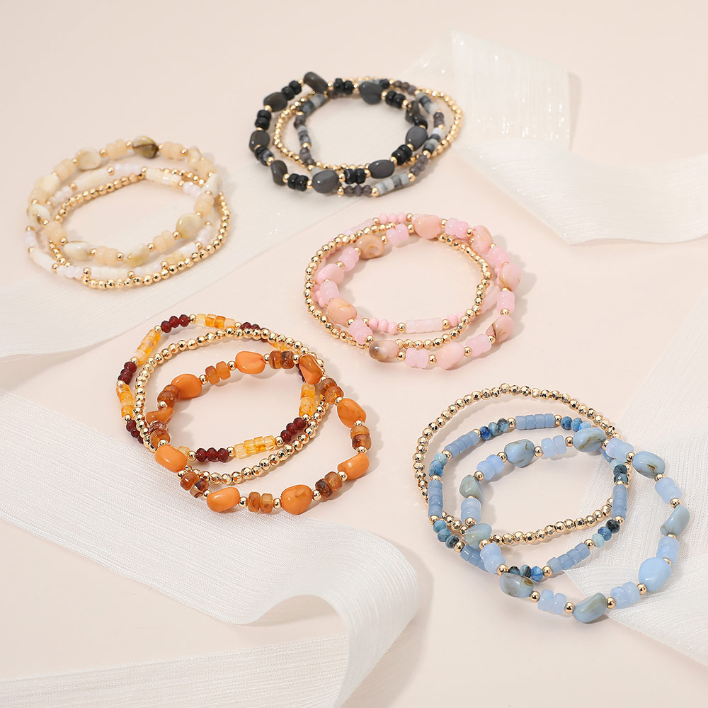 3PCS - Resin Pebble Metal Ball Beaded Stretch Multi Layered Bracelets