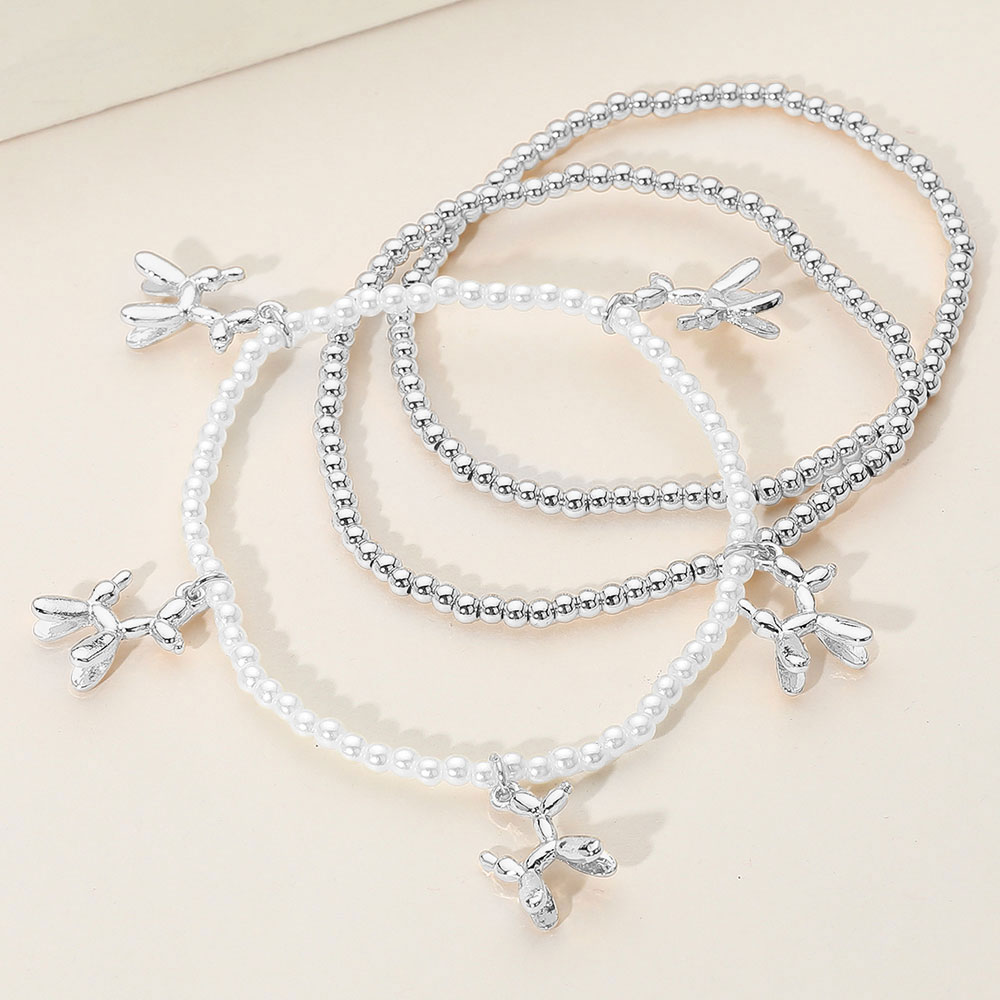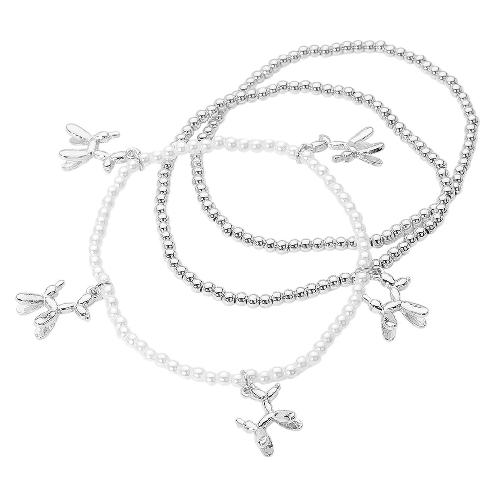 3PCS - Gold Dipped Balloon Dog Charm Metal Ball Pearl Beaded Stretch Multi Layered Bracelets