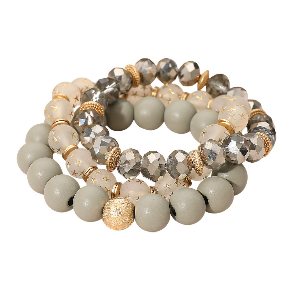 Details • Size : 1.25" H • Stretchable • Stylish stackable bracelet set featuring mixed bead sizes, faceted accents, and decorative spacer details. Designed for easy layering, this stretch bracelet trio adds a chic, textured touch to everyday outfits or special occasions. • Lead and Nickel Compliant