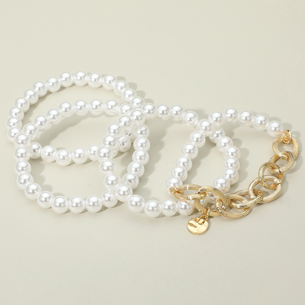 3PCS - Textured Metal Link Medal Charm Pearl Beaded Stretch Multi Layered Bracelets