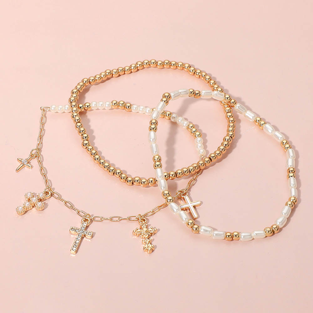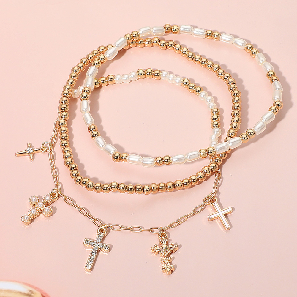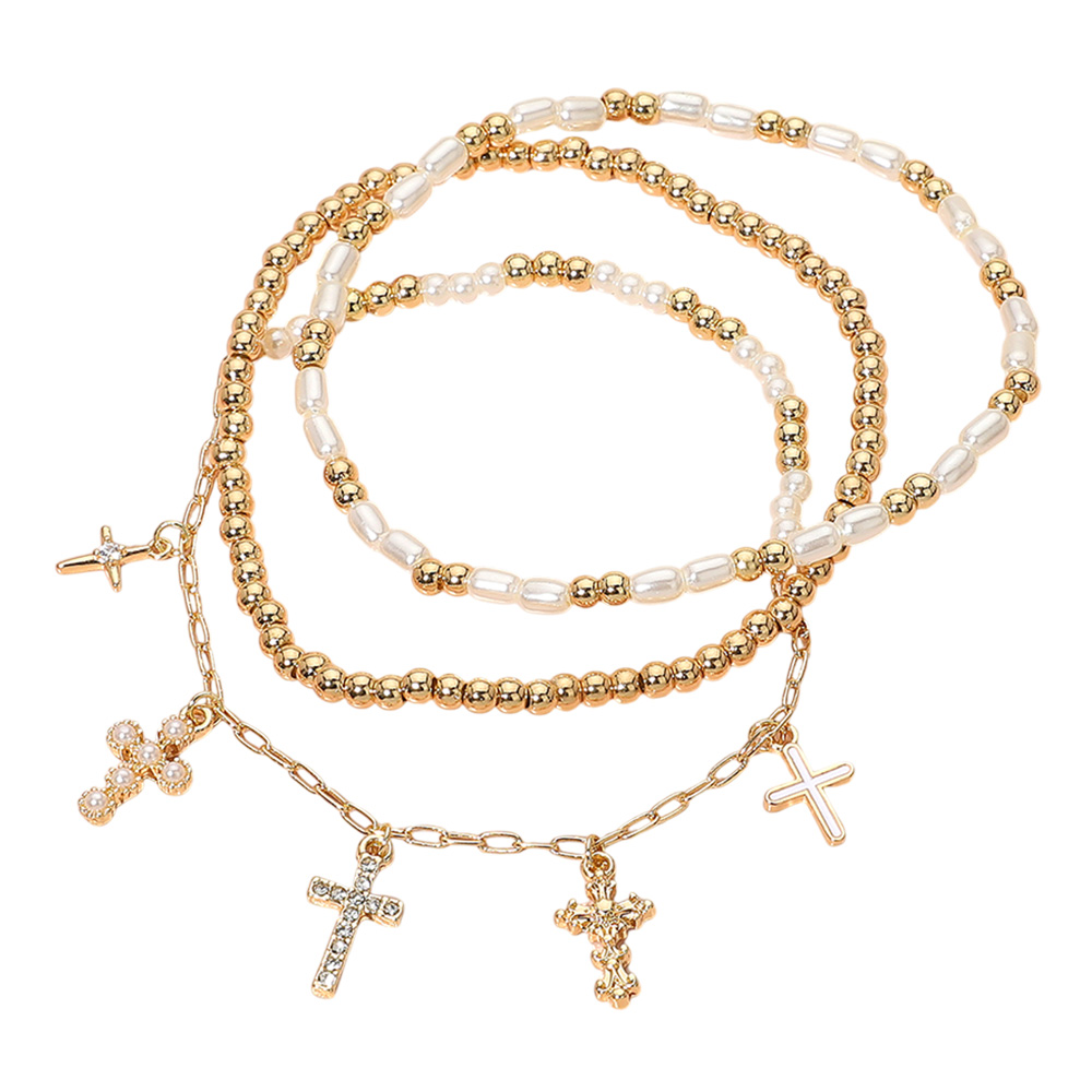 3PCS - Various Cross Charm Beaded Stretch Multi Layered Bracelets
