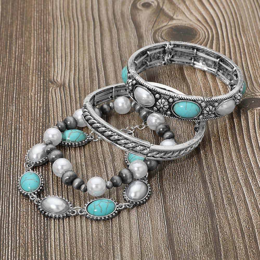 4PCS - Boho Oval Round Stone Embellished Stretch Multi Layered Bracelets