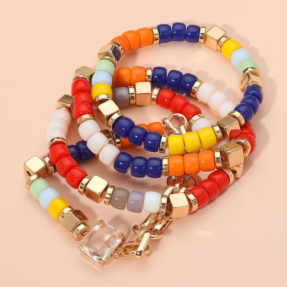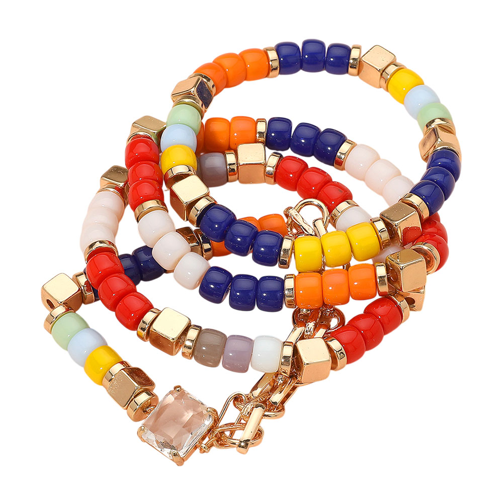 • Statement bracelet set featuring layered beaded strands with geometric metallic spacers and a faceted charm. Ideal for vibrant, everyday styling.