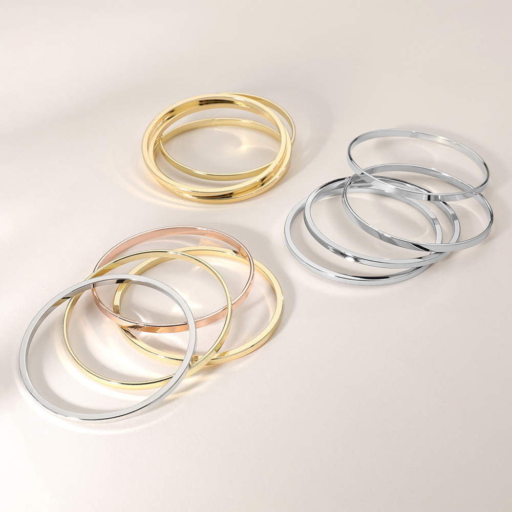 • Stylish bracelet set featuring multiple sleek bangles for a polished layered look. Wear them together or mix and match with other pieces. A versatile, modern accessory that elevates casual and dressy outfits with effortless elegance.