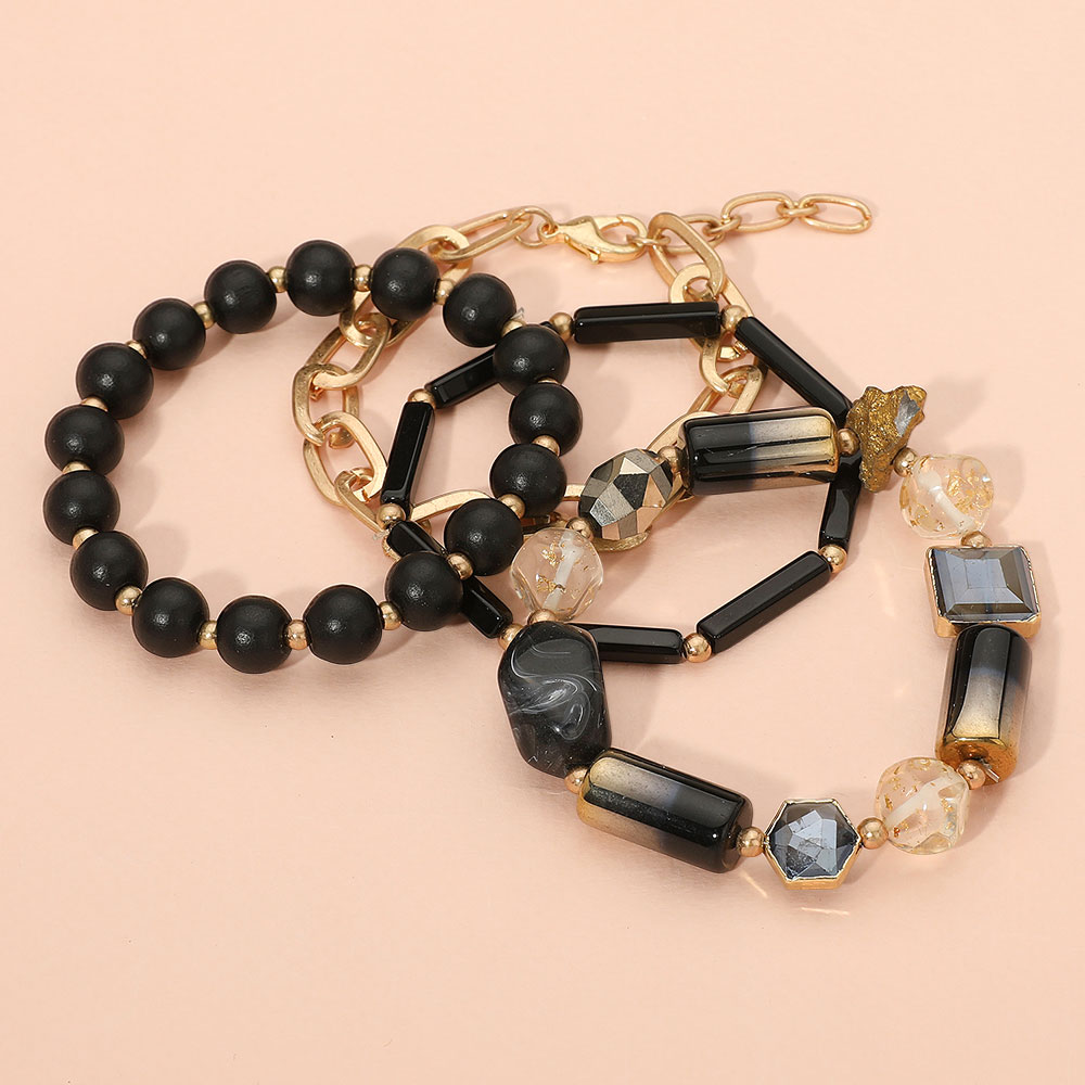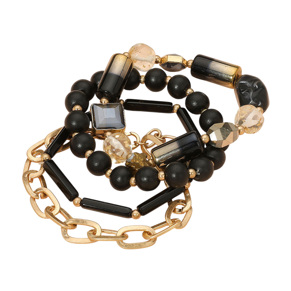 Details • Size 1 : 0.15" H - 0.5" H / Stretchable • Size 2 : 0.3" H, 7 + 1" L / Lobster Clasp Closure • Elegant layered bracelet set with black beads, gold accents, and mixed textures. Perfect for chic, versatile styling from day to night. • Lead and Nickel Compliant