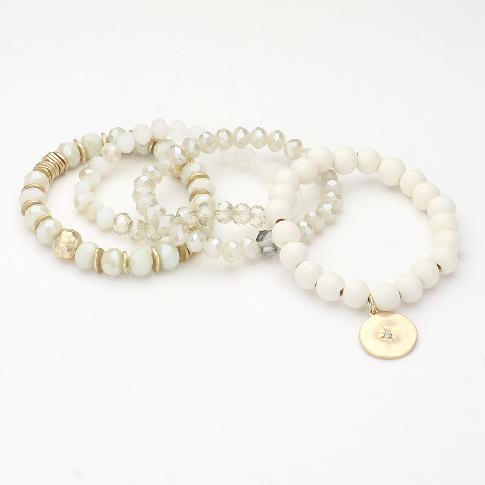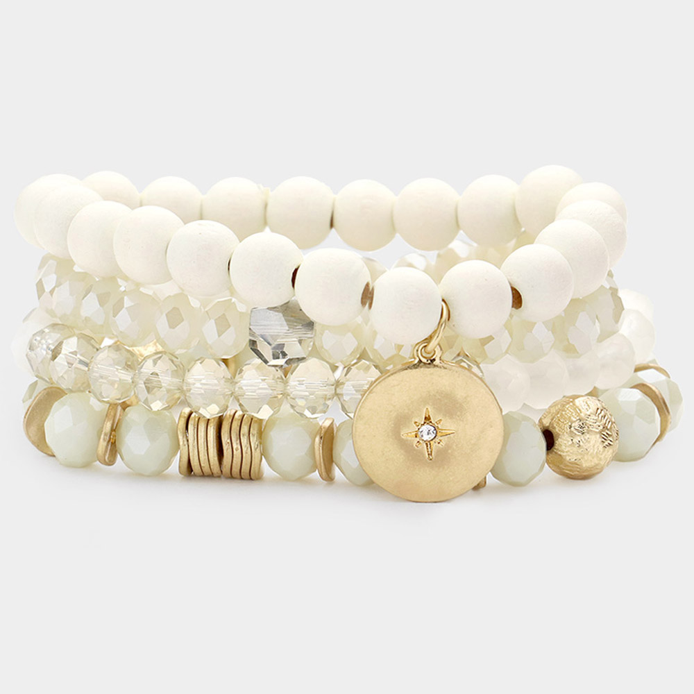 4PCS - North Star Accented Round Charm Wood Faceted Beaded Stretch Bracelets