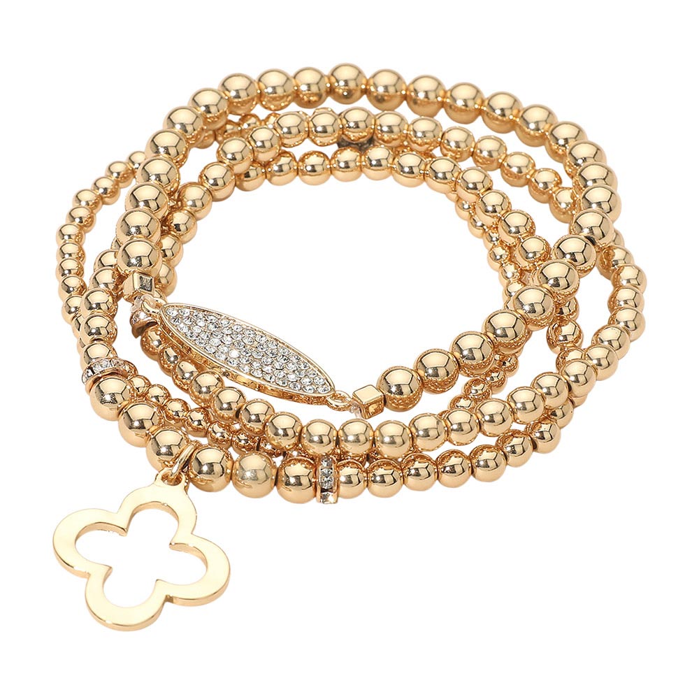 4PCS - Open Quatrefoil Charm Accent Metal Ball Beaded Stretch Multi Layered Bracelets