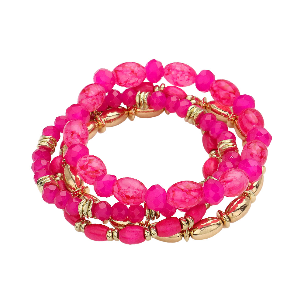 4PCS - Oval Wood Metal Faceted Beaded Stretch Multi Layered Bracelets