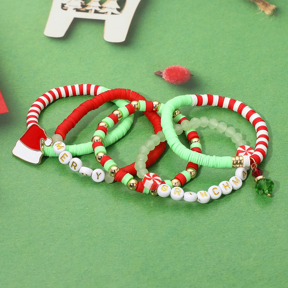 Details • Size : 1.75" H • Stretchable • Celebrate the season with this Christmas coil bracelet set featuring playful letter beads, candy stripe accents, festive charms, and holiday-inspired details. Perfect accessory for parties, gifting, or spreading cheerful style during celebrations. • Lead and Nickel Compliant