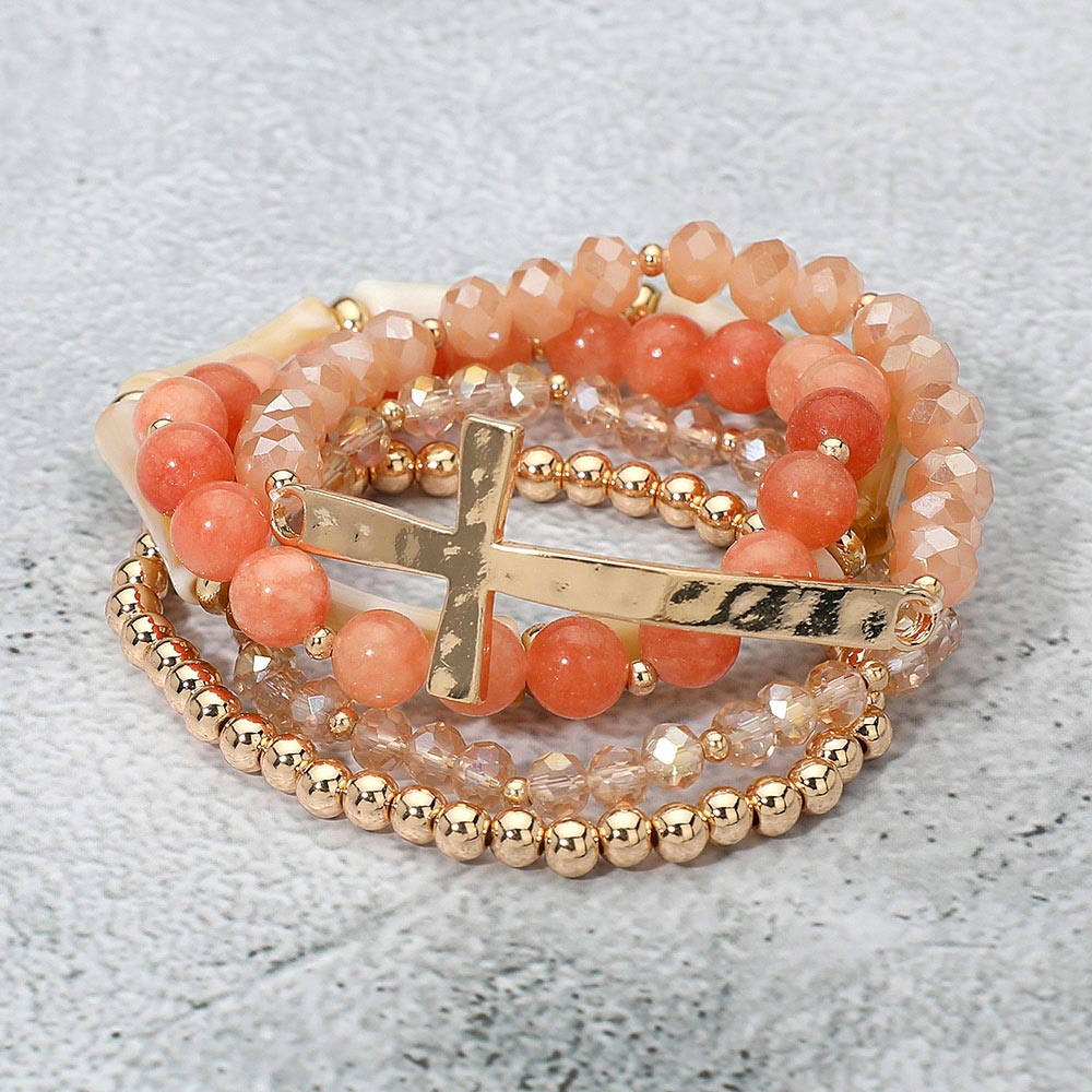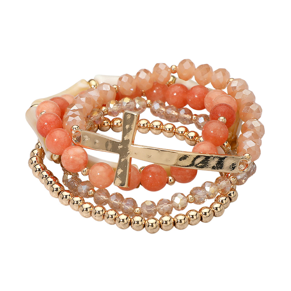 5PCS - Metal Cross Accent Resin Bamboo Bar Faceted Beaded Stretch Multi Layered Bracelets