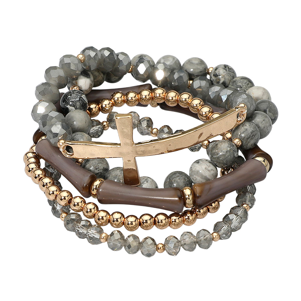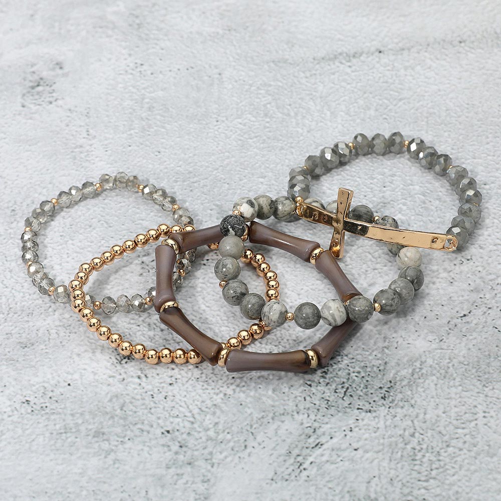 5PCS - Metal Cross Accent Resin Bamboo Bar Faceted Beaded Stretch Multi Layered Bracelets