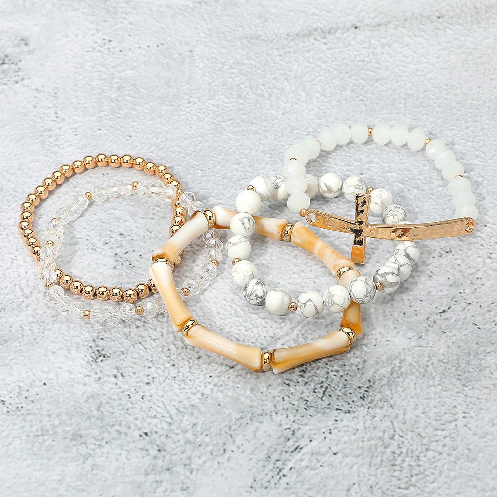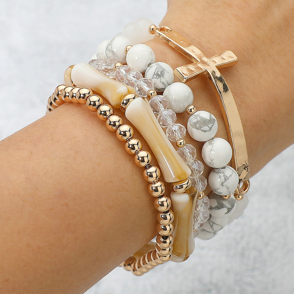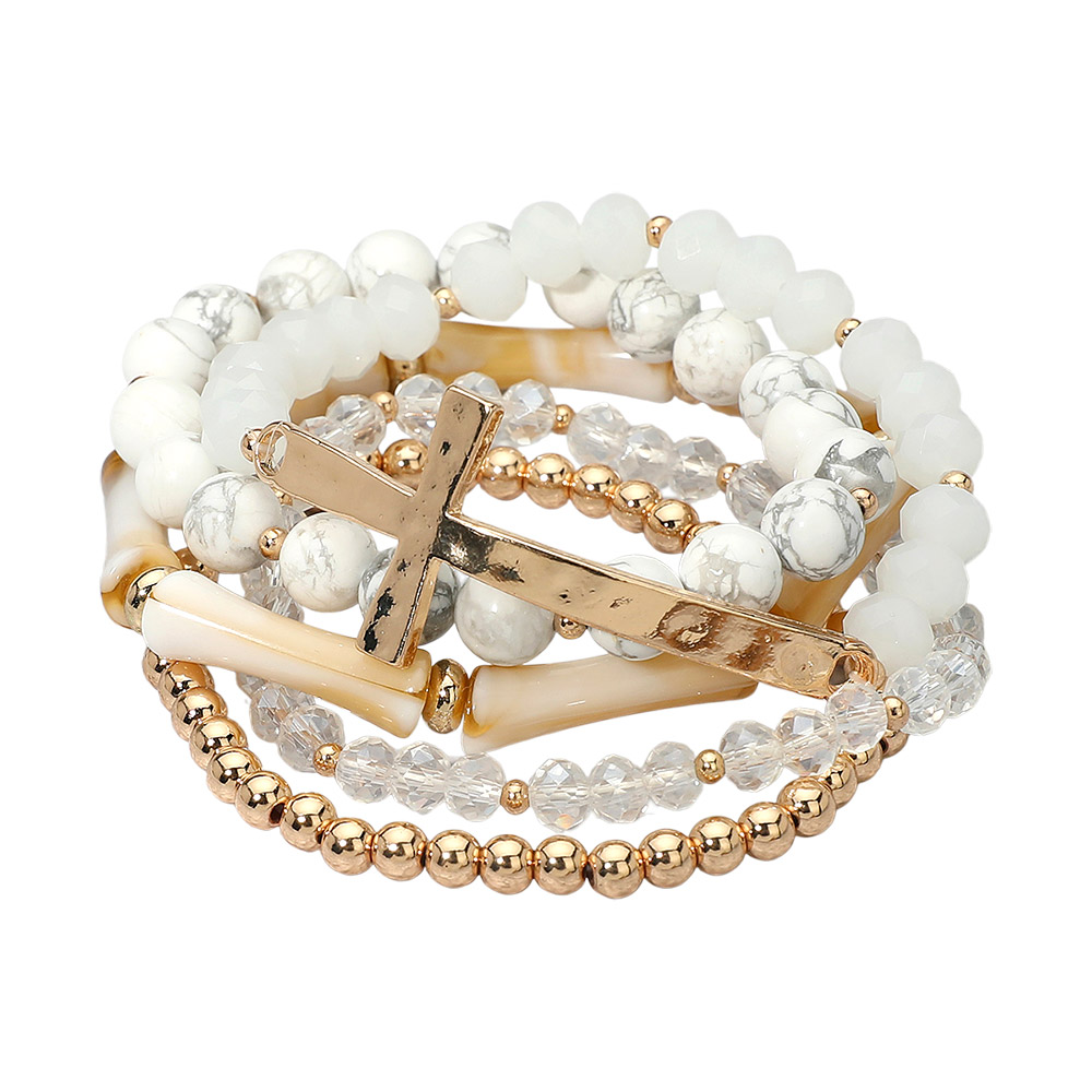 5PCS - Metal Cross Accent Resin Bamboo Bar Faceted Beaded Stretch Multi Layered Bracelets