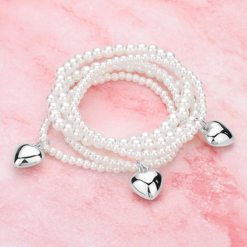 Details • Size : 1" H • Charm Size : 0.6" X 0.75" • Stretchable • Wrap your wrist in elegance with this multi-strand beaded bracelet featuring glossy beads and polished heart charms. Stretch design offers an easy fit, perfect for casual wear or romantic occasions. Layered look adds charm and versatility to any outfit. • Lead and Nickel Compliant