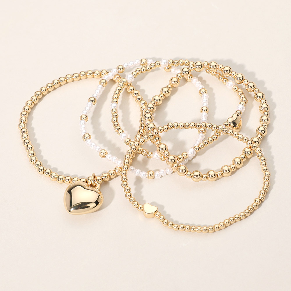 5PCS - Metal Heart Charm Pointed Ball Pearl Beaded Stretch Multi Layered Bracelets