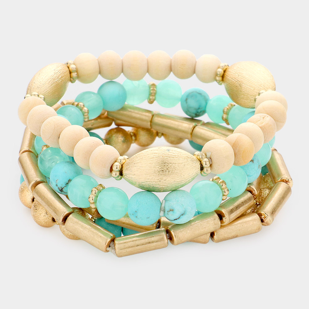 5PCS - Flat Wood Metal Ball Faceted Beaded Stretch Multi Layered Bracelets