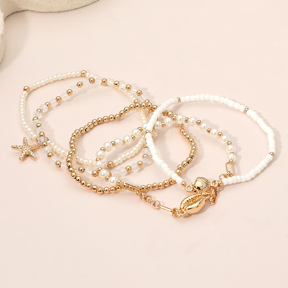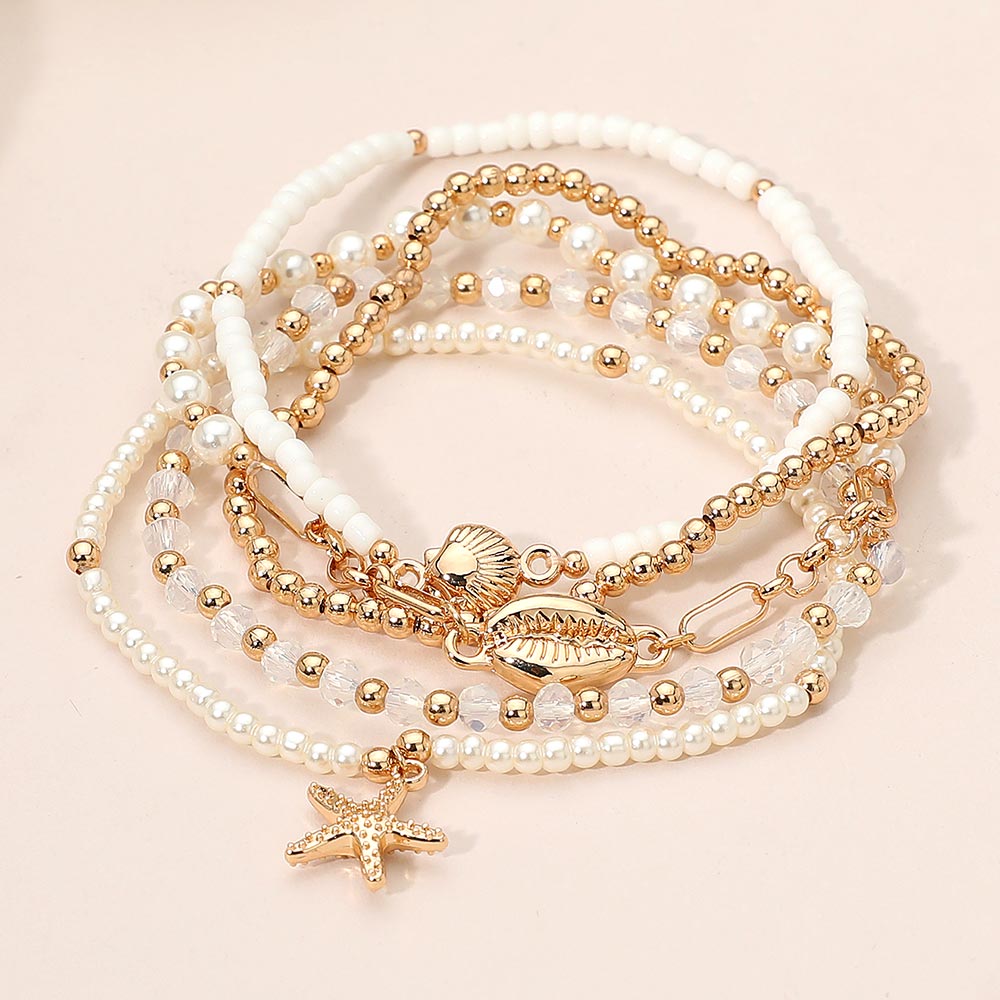 • Bring seaside elegance to your style with this Ocean Charm Beaded Layered Bracelet Set. Featuring shells, pearls, and starfish accents, this five-piece stack creates a playful coastal look. Ideal for adding a breezy, beach-inspired touch to casual or summer outfits.